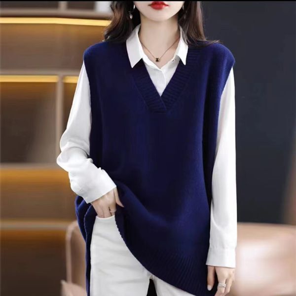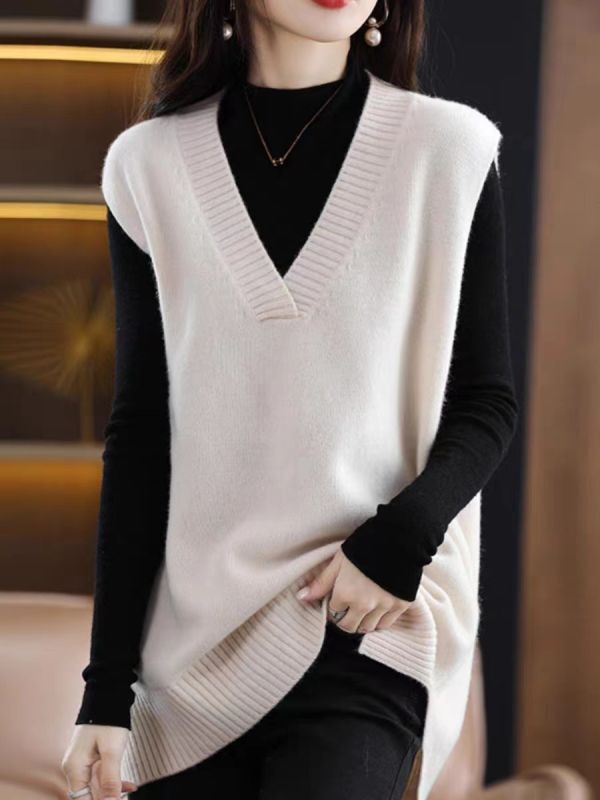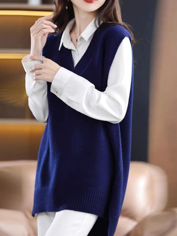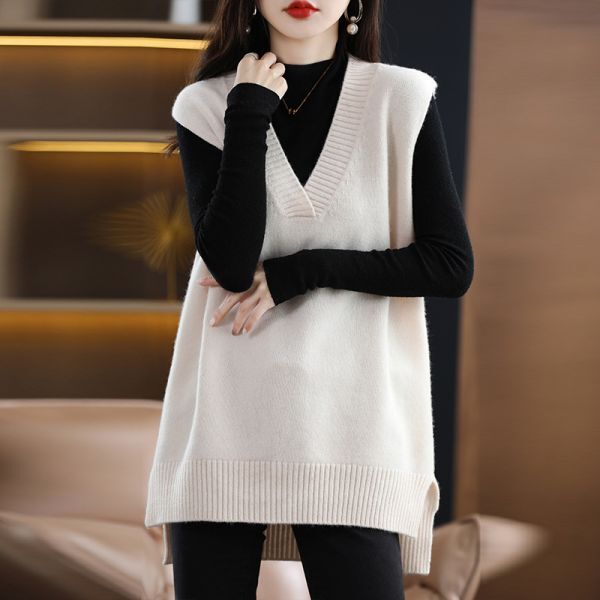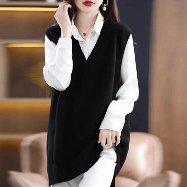 新品 / ニットベスト ニットセーター Vネック ロング丈 ニットトップス 袖なし おしゃれ 可愛い レディース チョッキ / ブラック