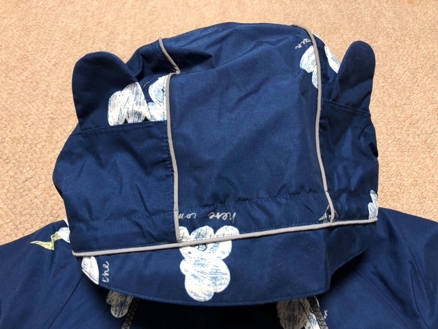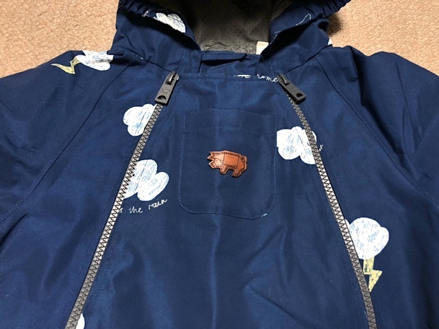 • 防水性、長袖、動物の耳が一体化、刺繍パッチ、フロントパッチポケット、足首がタイト、