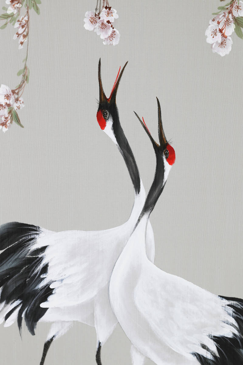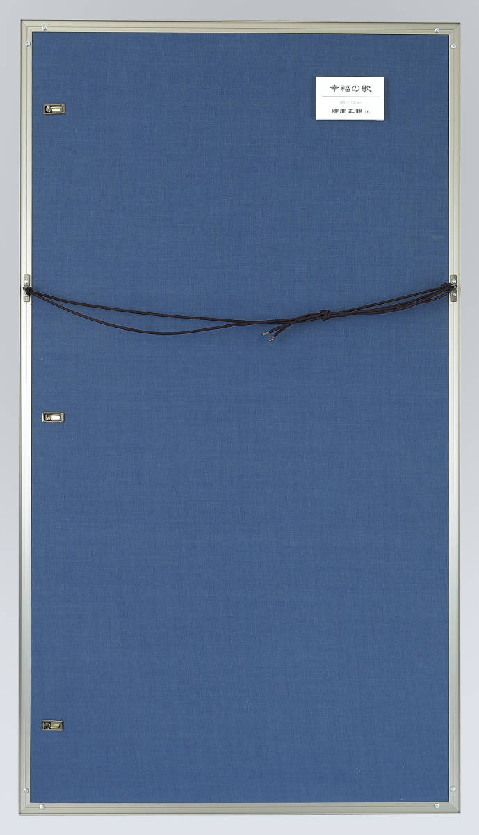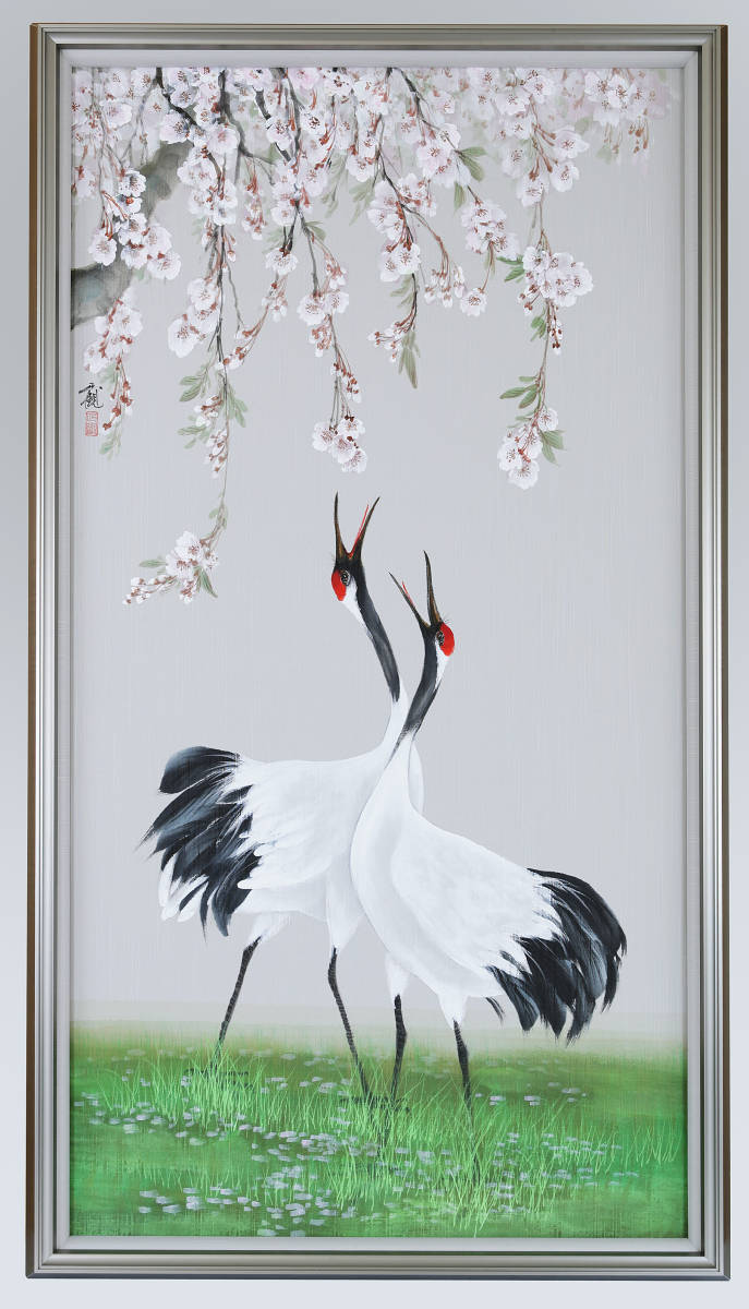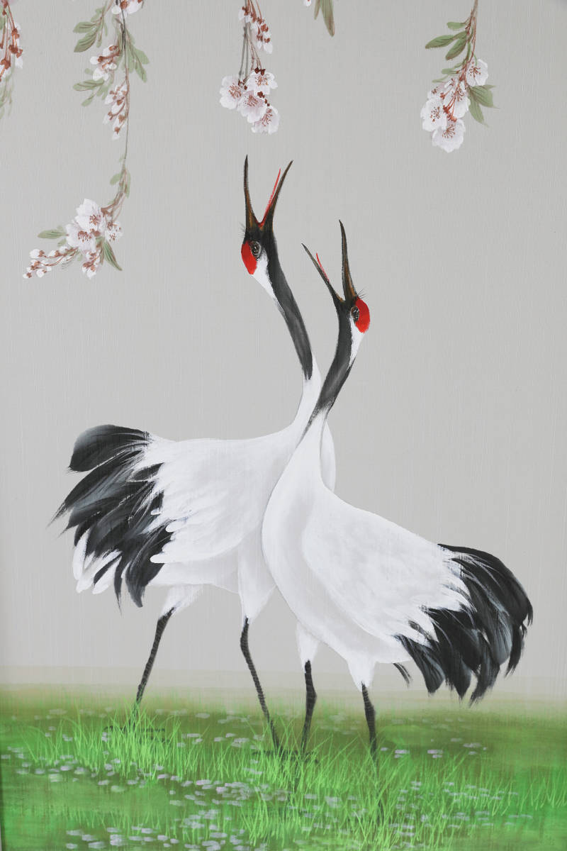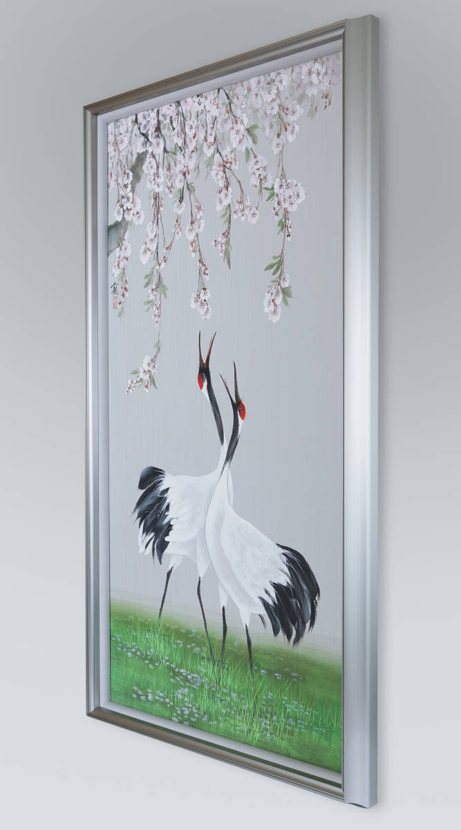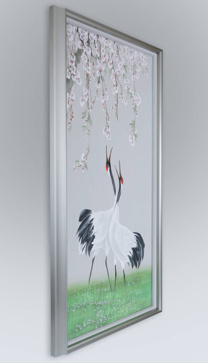 【真作】郷間正観作 「双鶴 幸福の歌」【2023年作・状態良好】 絹本墨色著色アルミ額装絵 額寸法:幅約52cm×高約94cm×厚約5cm