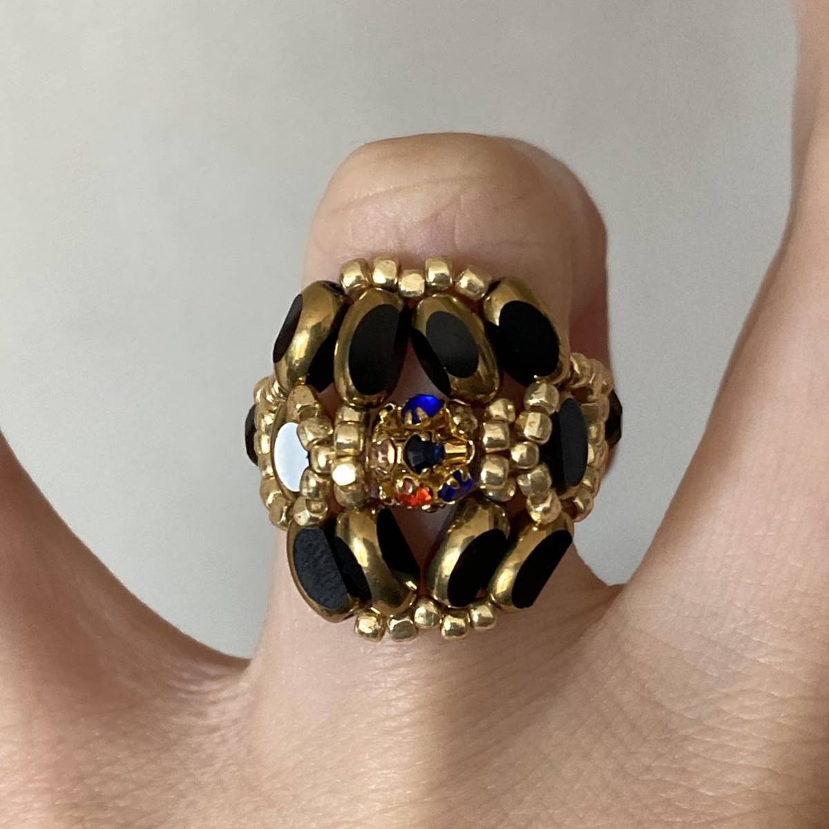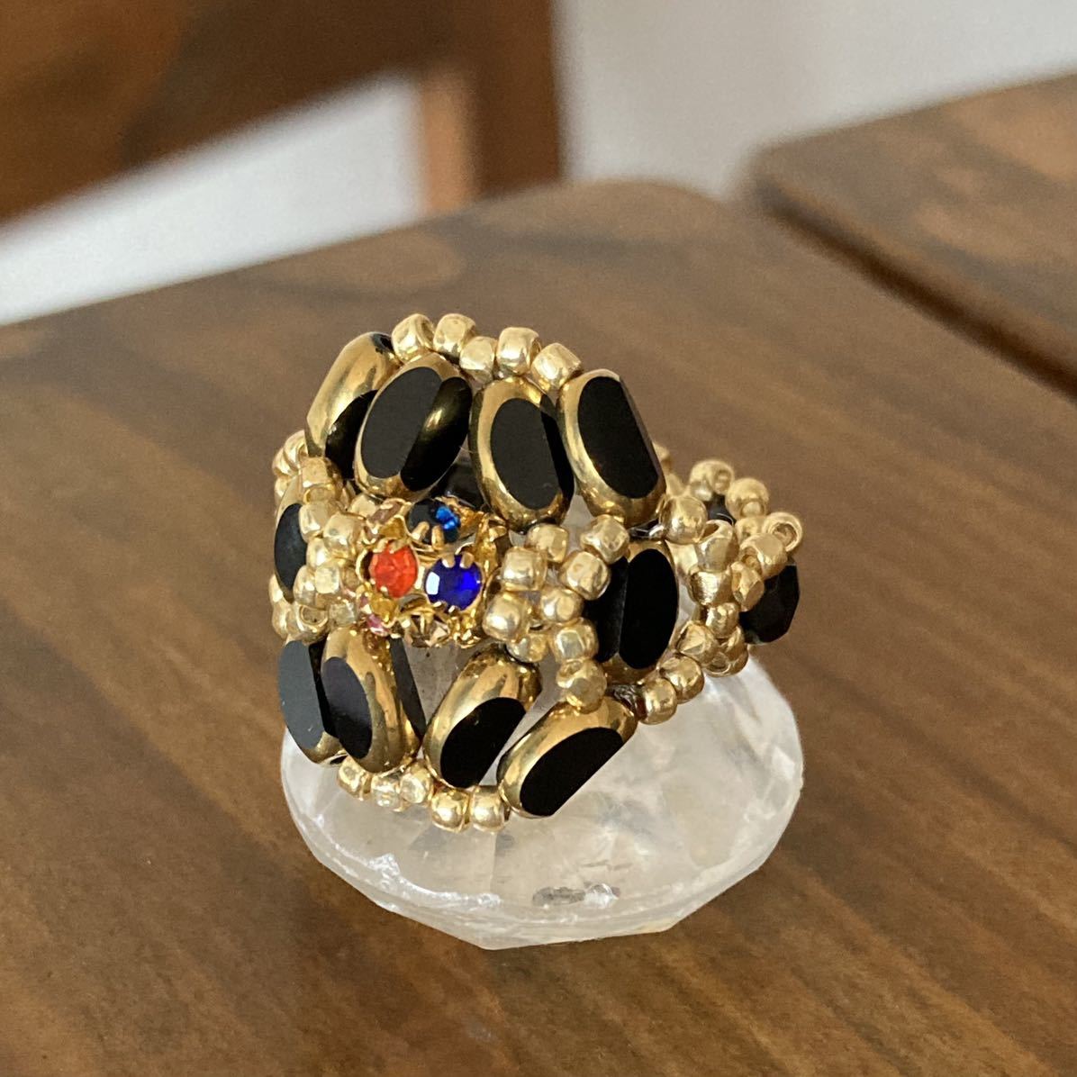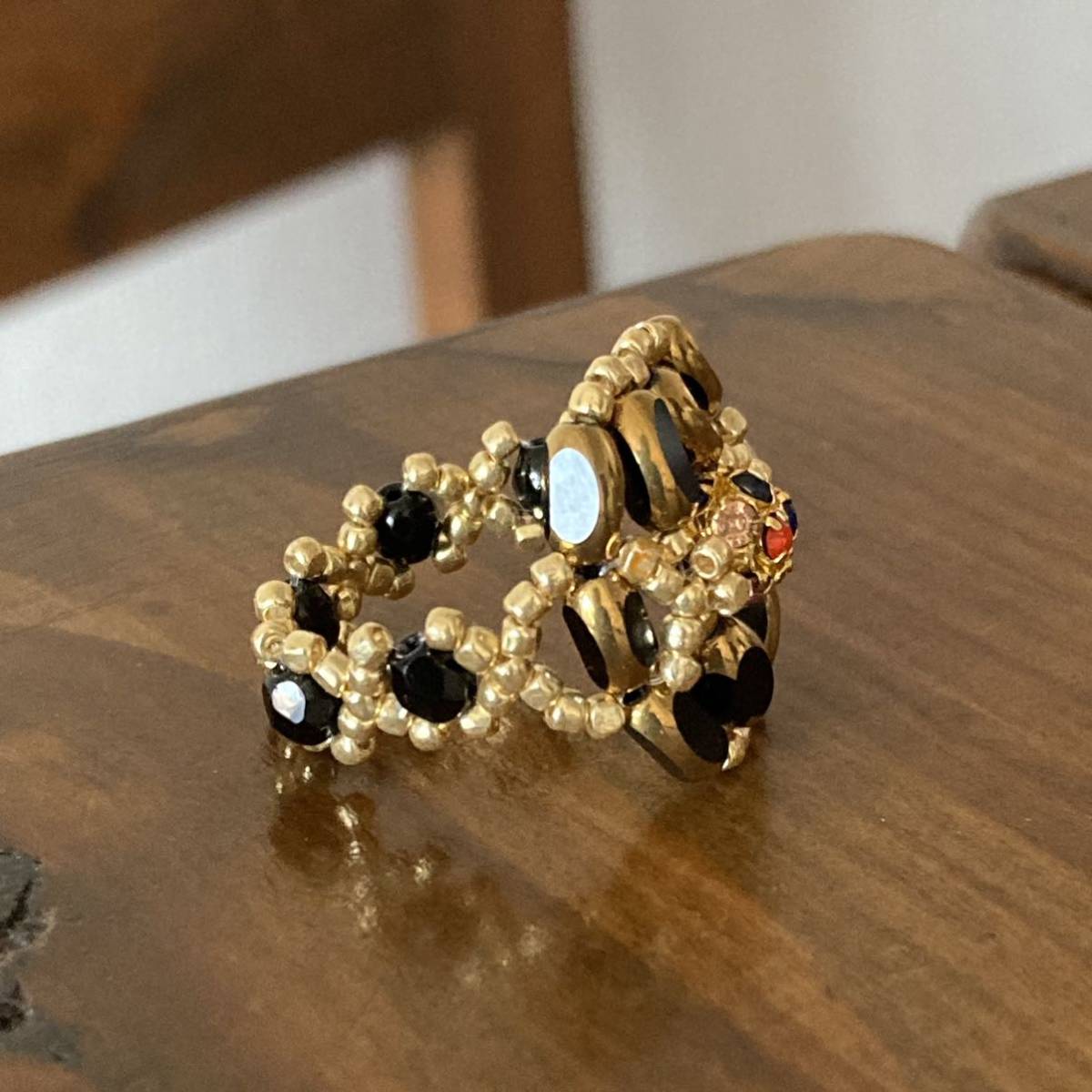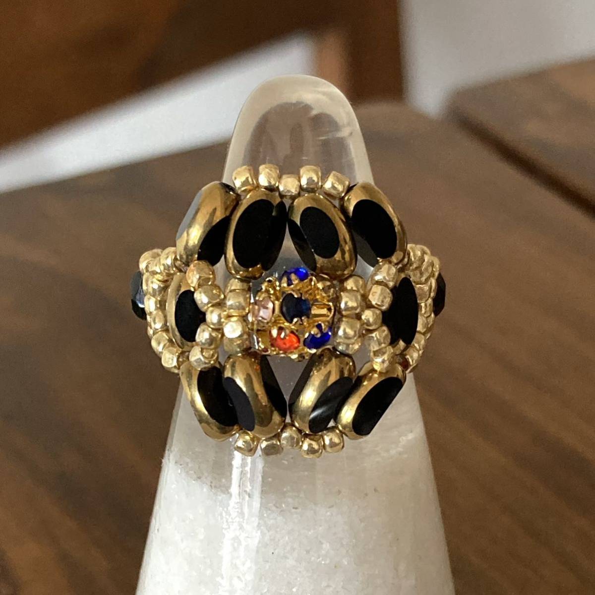 7mmの黒のナツメガラスビーズ、中心は6mmのゴールドにカラフルなラインストーンの丸ロンデル、4mmの黒のチェコビーズ、ゴールドのスリーカットビーズ等で作ったリングです。