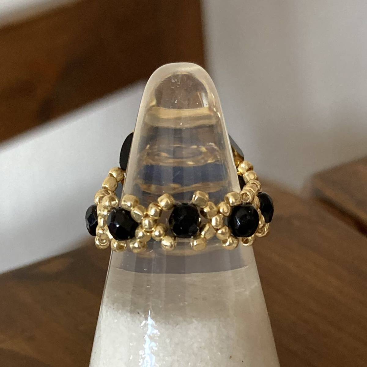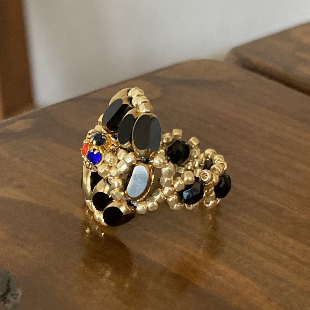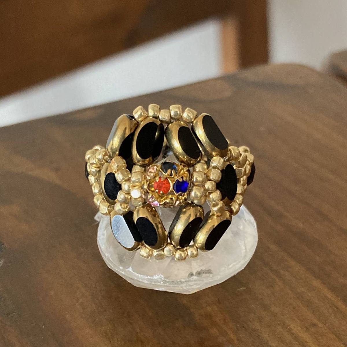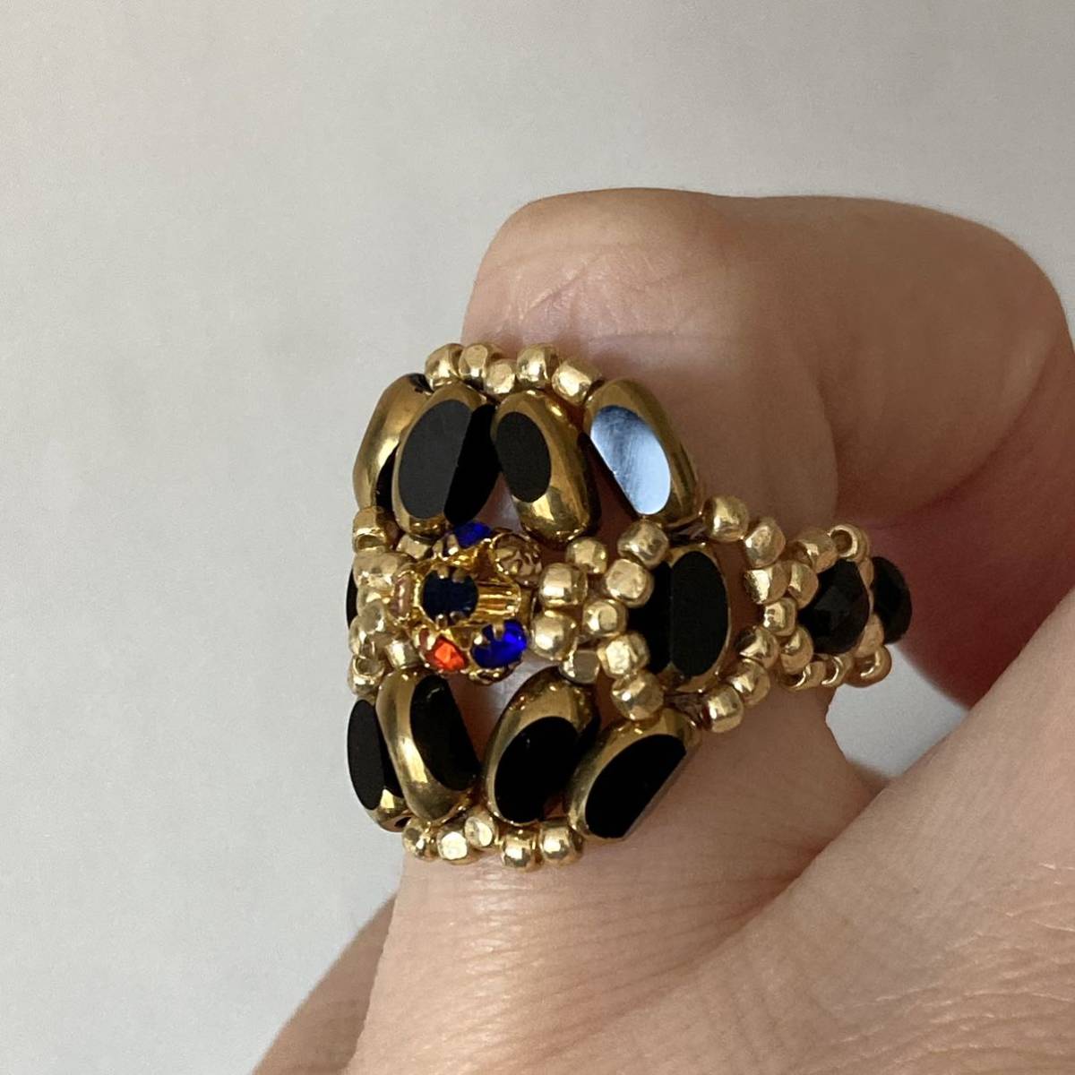 7mmの黒のナツメガラスビーズ、中心は6mmのゴールドにカラフルなラインストーンの丸ロンデル、4mmの黒のチェコビーズ、ゴールドのスリーカットビーズ等で作ったリングです。