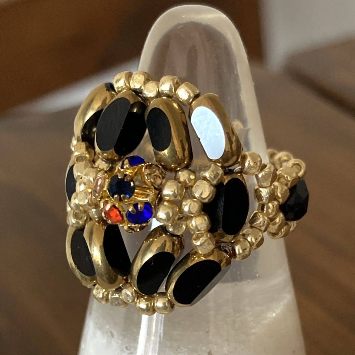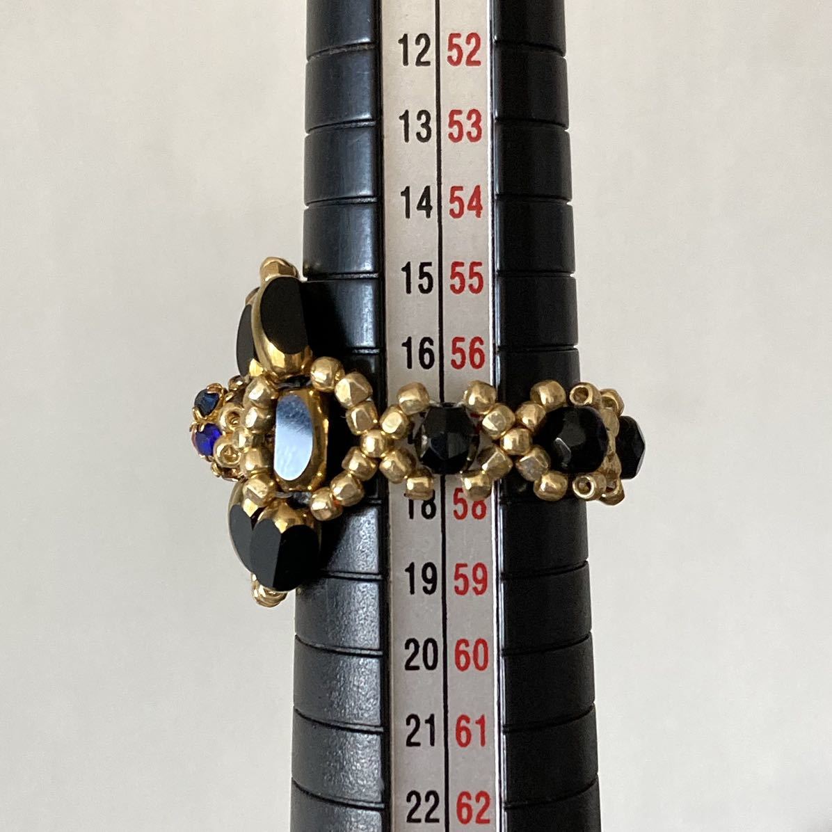 ビーズ リング 指輪 ハンドメイド カラフルなラインストーンとナツメビーズのリング 黒×ゴールド 16ー18号です。