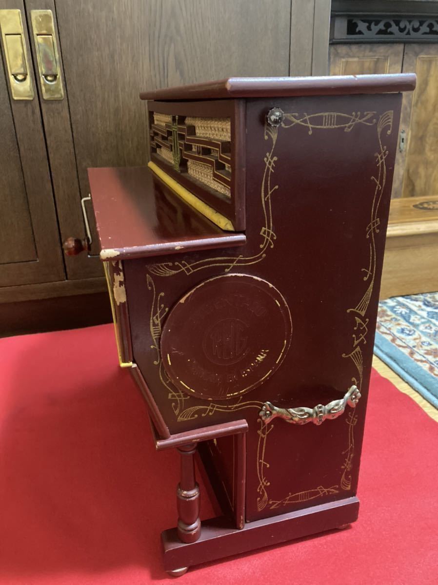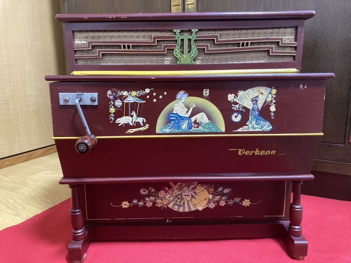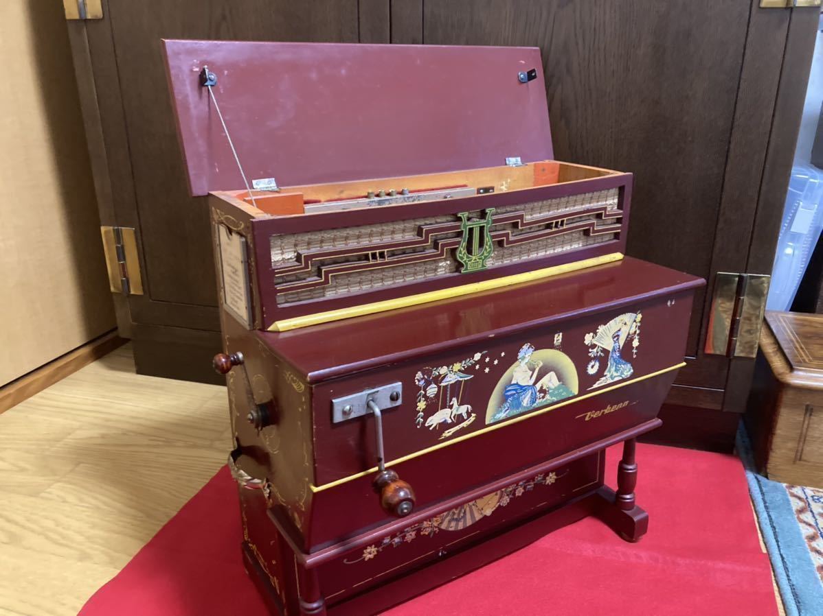 正面の手回しハンドルを右まわりに回すと演奏出来ます。左サイドのレバーを回すと、曲が4曲変えられます。1940年頃の物ではないかと思われます。貴重なアンティーク手回しオルガンです。
