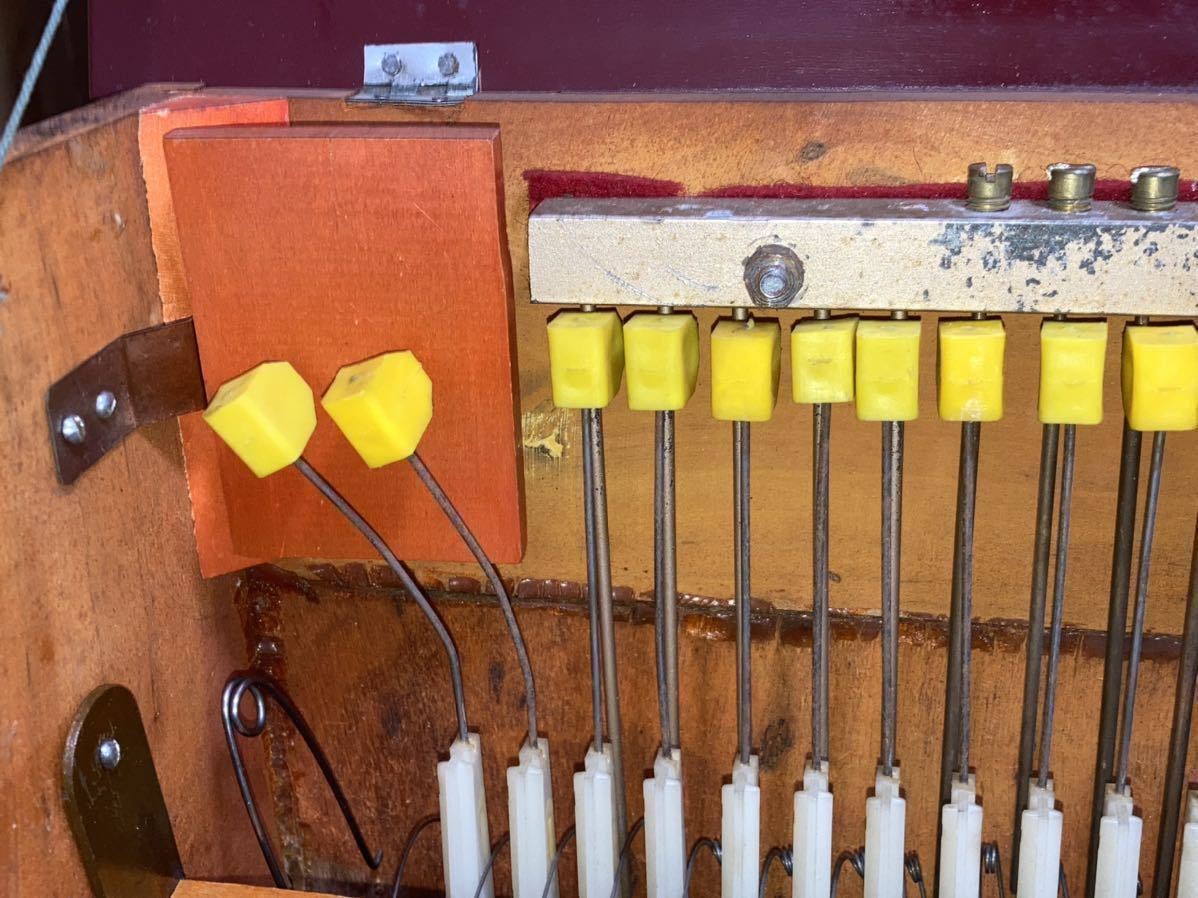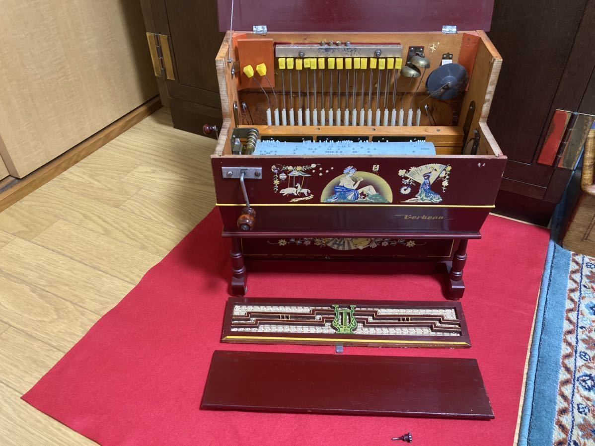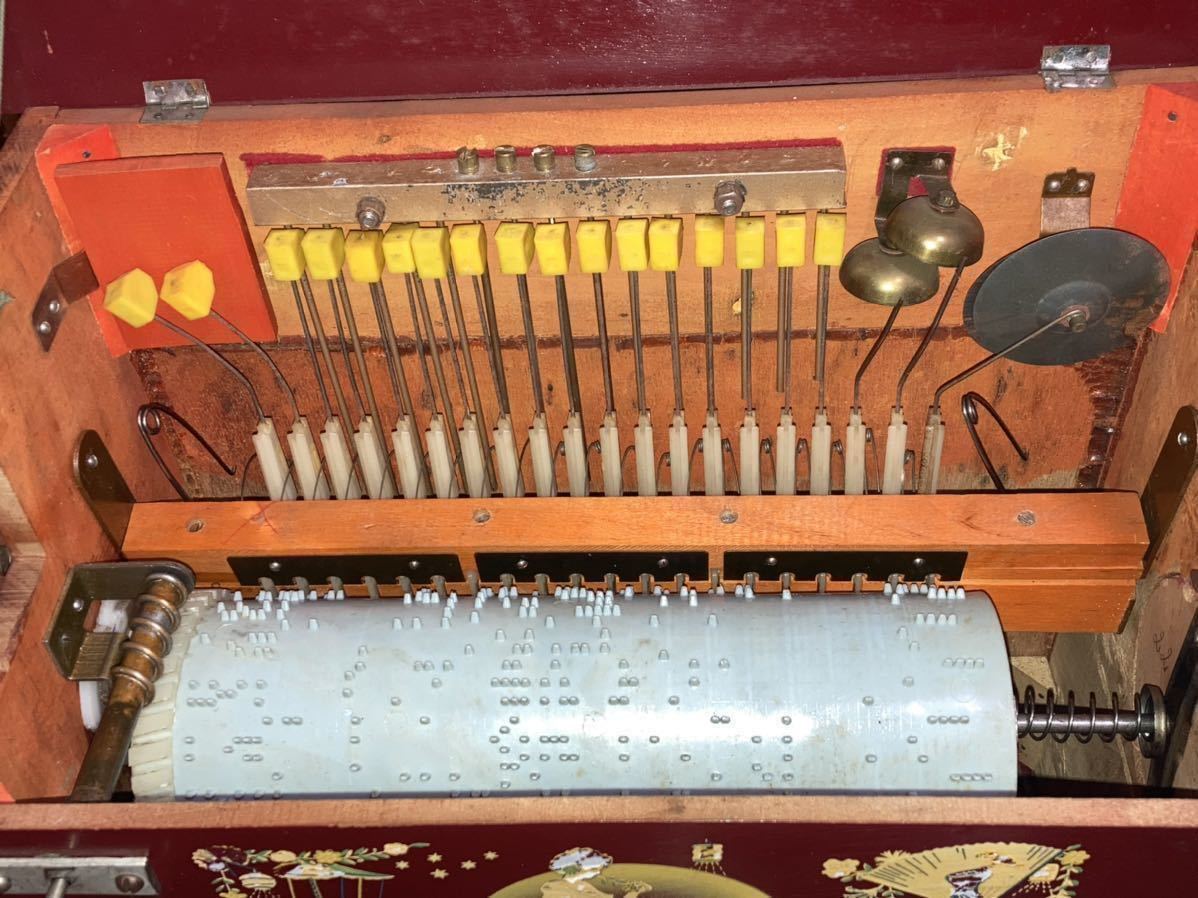 シリンダーで弾かれるレバーは、右から2つ目が摩耗しています。【写真7枚目】が、全体的にコンディションは素晴らしいと思います。本体は木製ですし、インテリアとしてもいいでしょう!