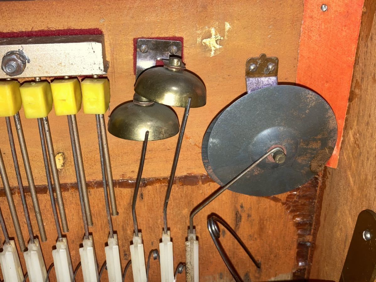 内部は、左側にカスタネット、中央に音階のある金属製のバー、右側にベル2つ、シンバルがあり、ハンマーで叩いて演奏される仕組みとなっています。