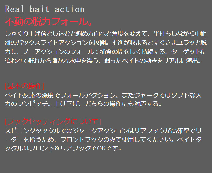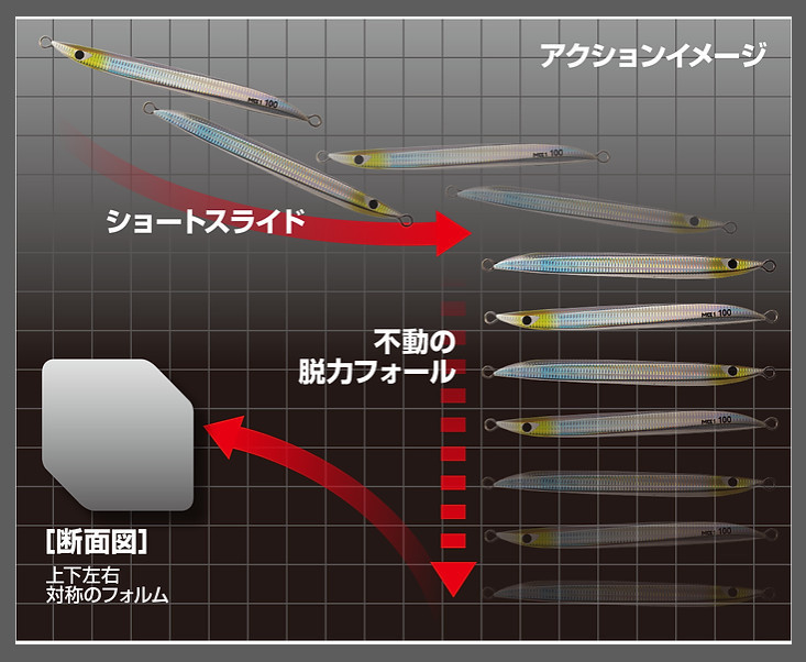 ジャークもフォールも同様のアクションを起こす上下左右完全対称のフォルムは、上げ下げいずれにおいても進行方向が頭となり切り込みやすく、ベイトの群れの中で中距離のハーフスライドで誘う。