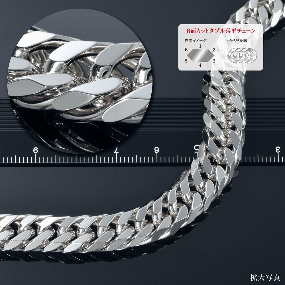 6面カットダブル喜平(きへい)チェーンとは通常の喜平チェーンと比べコマの数が倍になったデザインをダブル喜平といいます。コマの隙間が少なくなる事でみっしりとした重量感とボリューム感が増し、より高級感溢れるデザインに仕上がっています。 また、ひとつひとつのコマに6面のカットが入っておりキラッとした輝きはよりエグゼクティブな印象を与えてくれます。 ![]() |