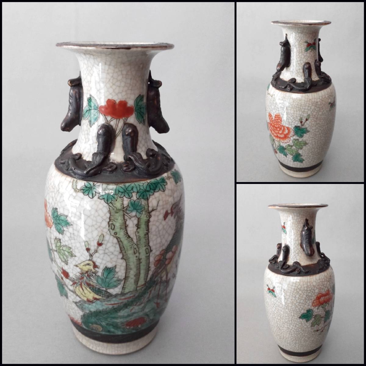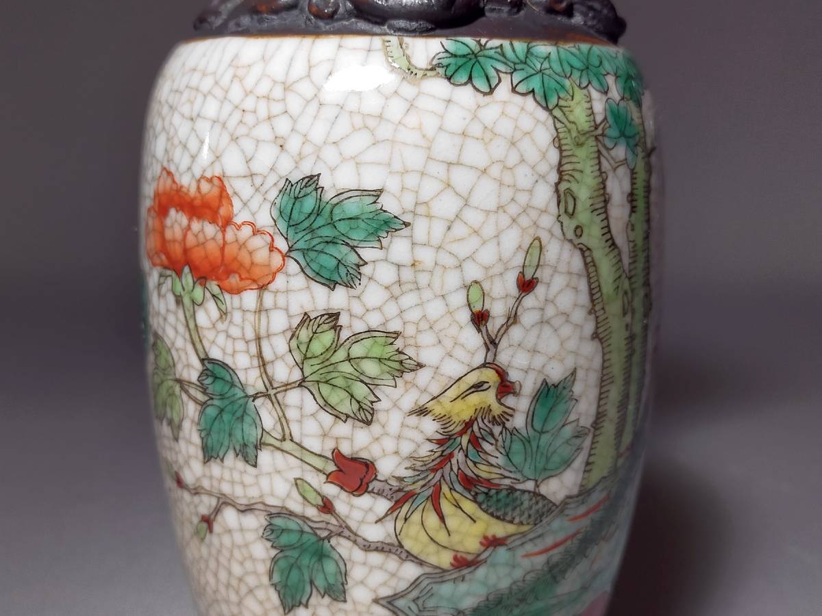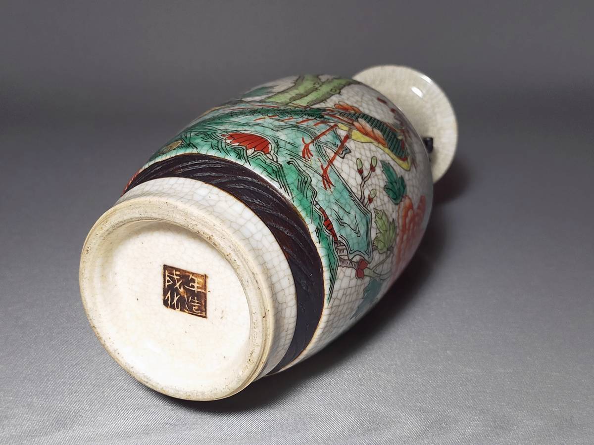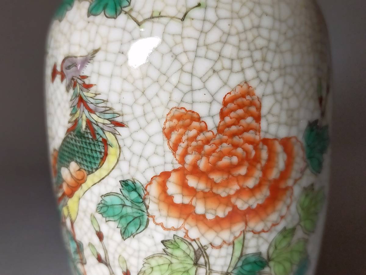 中国陶器 花瓶 成化年造 款 哥窯 双耳五彩瓶 色絵鳳凰花蝶文 瓶 高20.3cm 唐物 古玩
