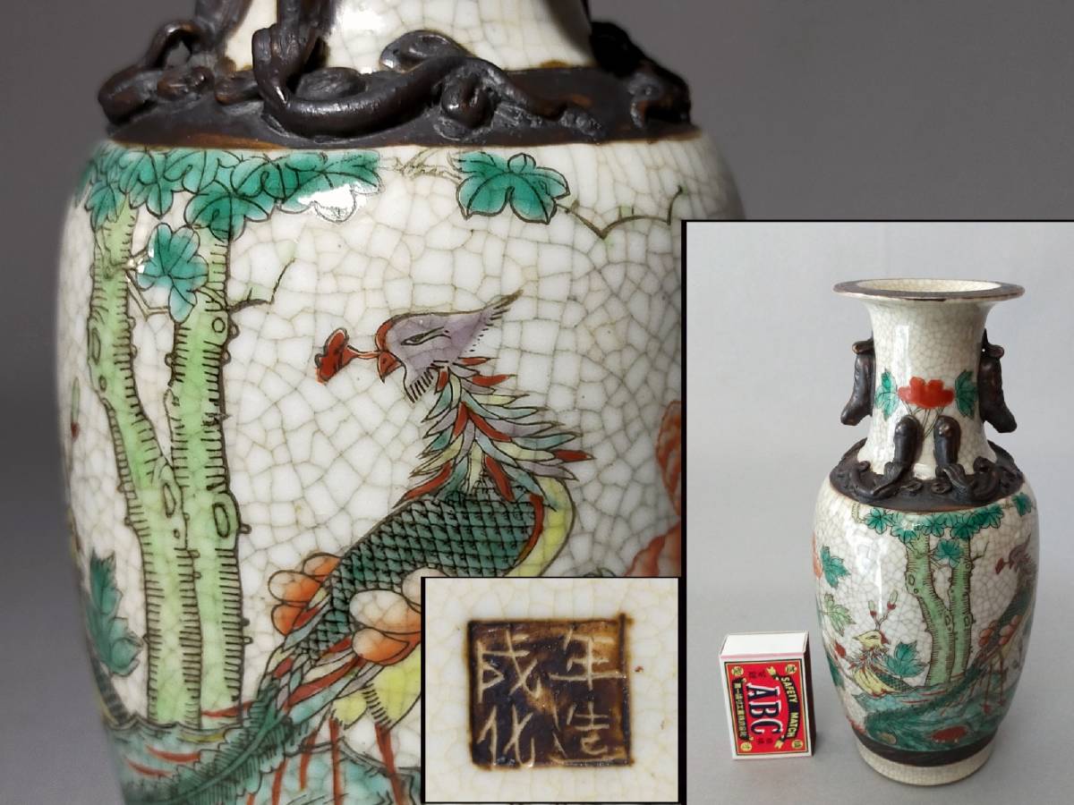 TF16 中国陶器 花瓶 成化年造 款 哥窯 双耳五彩瓶 色絵鳳凰花蝶文 瓶 高20.3cm 唐物 古玩