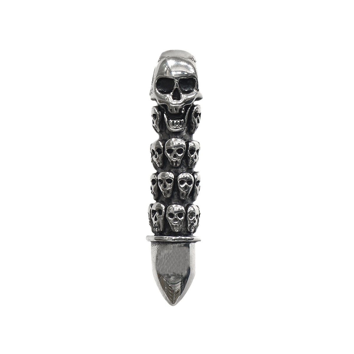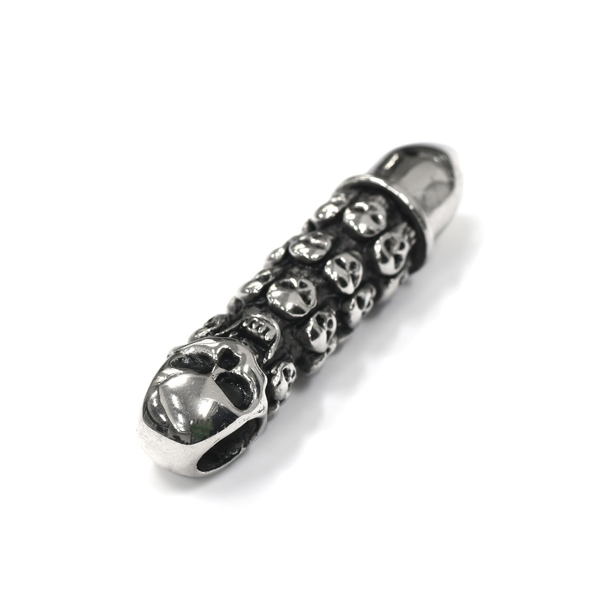 スカル柄の弾丸モチーフペンダントネックレスです。 素材には本体・チェーン共に金属アレルギーに強いステンレスを使用。 |