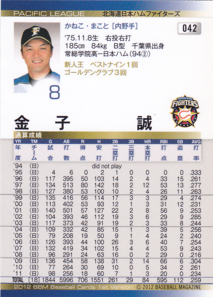 2012BBMベースボールカード1st 042 金子誠 日本ハム 千葉県 常総学院高校