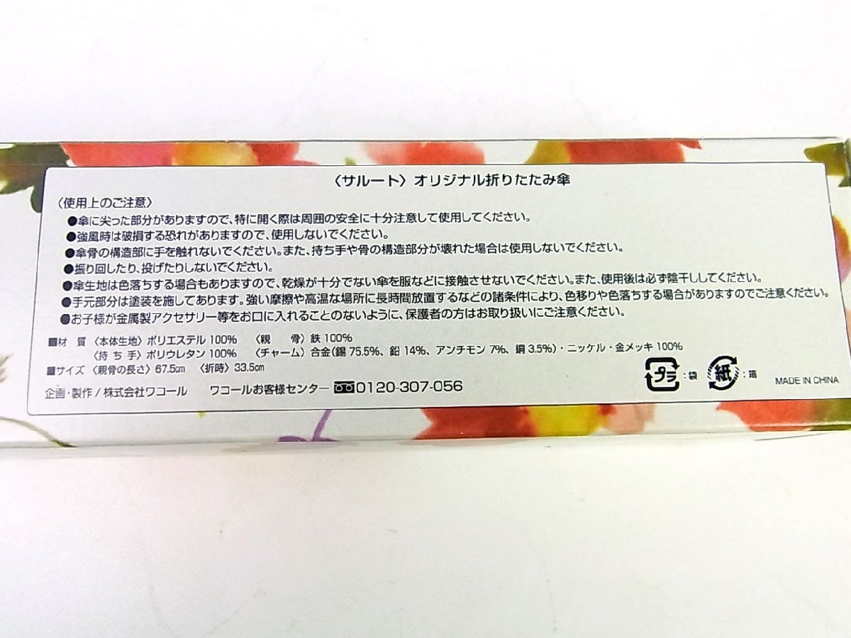■■■メーカー■■■ wacoal/ワコール ■■■品 名■■■ 折り畳み傘 晴雨兼用 ラインストーン チャーム付 salute/サルート ノベルティ ■■■サ イ ズ■■■ ●親骨の長さ:67.5cm ●折時:33.5cm ■■■カ ラ ー■■■ プレジャーオレンジ ■■■状 態■■■ 【未使用】 未使用品ではございますが、保管品であることをご理解の上、ご入札下さい。 ※お譲りするものは画像の物が全てです。 ※外箱にスレ等の傷みが若干ございます。 ※綺麗に畳まれたままの商品ですので、広げての検品は行っておりません。畳まれた内側にシミ等あった場合でも現状渡しとなりますので、ご了承下さいませ。 ■■■商品説明■■■ ★★サルート 春夏のノベルティ★★ ●持ち手にはサルートのラインストーン チャームアクセサリーが付いています。 ●花柄 【付属品】外箱 |