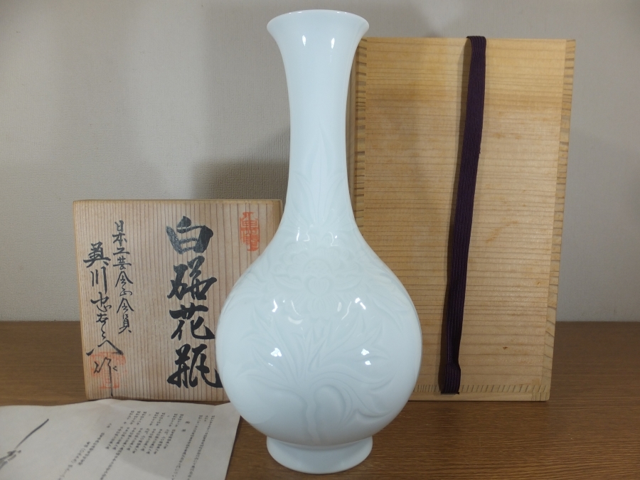| 説明 | 佐賀県出身 陶芸家 奥川忠右衛門の『白磁花瓶』自作 無傷 共箱 シオリ付です。 状態は良好です。 このままで飾って楽しめますし、使用しても楽しめます。 高台内に「忠右衛門作」と彫銘があります。 真白で美しい白磁の地に、描かれた草花紋様が大変綺麗で上品な作品です。 コレクターの放出品です、画像で御確認下さい。 ★九州地方の買出し品です。 買出したままでの出品です、御入札宜しくお願い致します。 入札は早めにお願い致します。 一人でも入札があれば梱包作業に入りますので、素早い発送が可能です。 早期終了あり。 初代 奥川忠右衛門は、(1901-1975) 大正-昭和時代の陶芸家。 明治34年4月10日生まれ。 佐賀県出身。 有田焼大物成形ろくろ師。 昭和35年、日展入選、 のち伝統工芸展最高賞をうける。 白磁の大型つぼ製作技術で、 39年、選択無形文化財保持者。 生涯、蹴ろくろのみを使用した。 昭和50年10月11日死去 74歳。 2代 奥川忠右衛門は、 昭和6年、西松浦郡有田町生まれ。 同22年から父である初代奥川忠右衛門に付いて陶芸を学ぷ。 同42年に県陶磁展で、翌43年には日本伝統工芸展で、 それぞれ初入選を果たす。 同48年には日本工芸会正会員に堆挙される。 同50年、父の死去に伴い、二代目奥川忠右衛門を襲名した。 日本伝統工芸会会員。 |