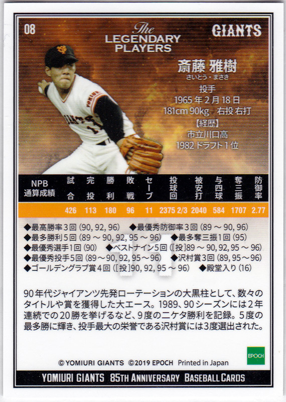 EPOCH 2019 読売ジャイアンツ/巨人 創設85周年記念ベースボールカード The Legendary Players レギュラーカード No.08 斎藤雅樹 野球カード