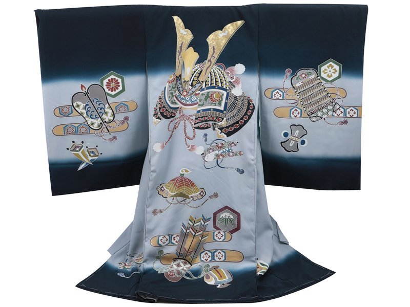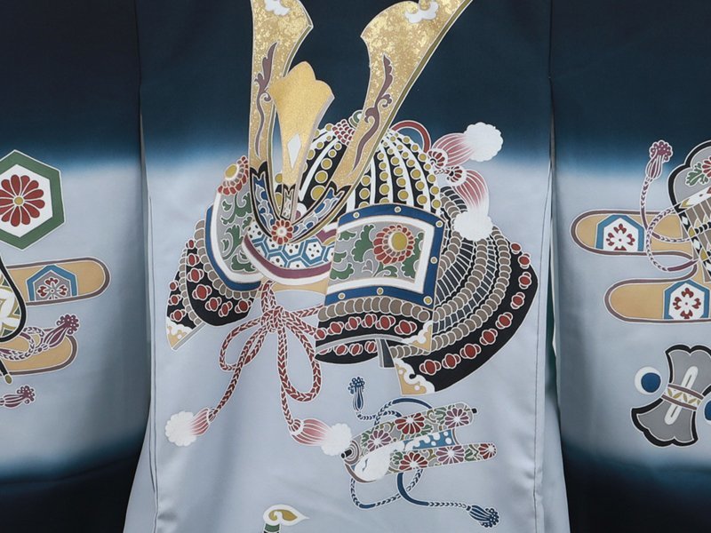 ■正絹 男の子 初着■お宮参り 着物 正絹 長襦袢 セット 男児 子供 産着 祝着 手描き友禅 カブト 濃紺 ud-161
