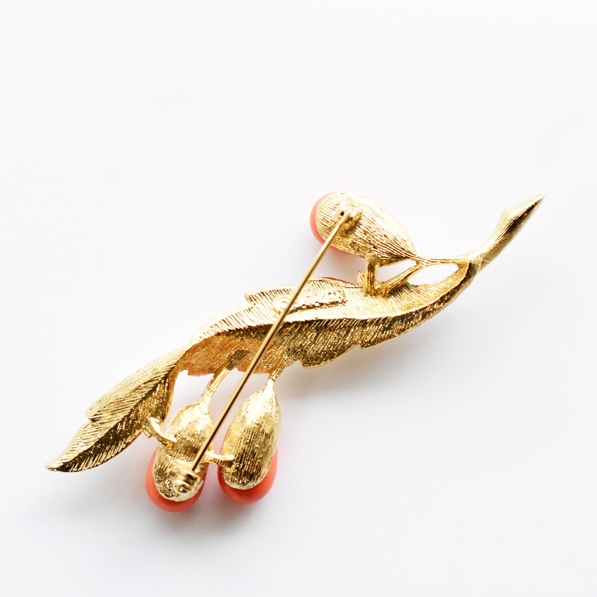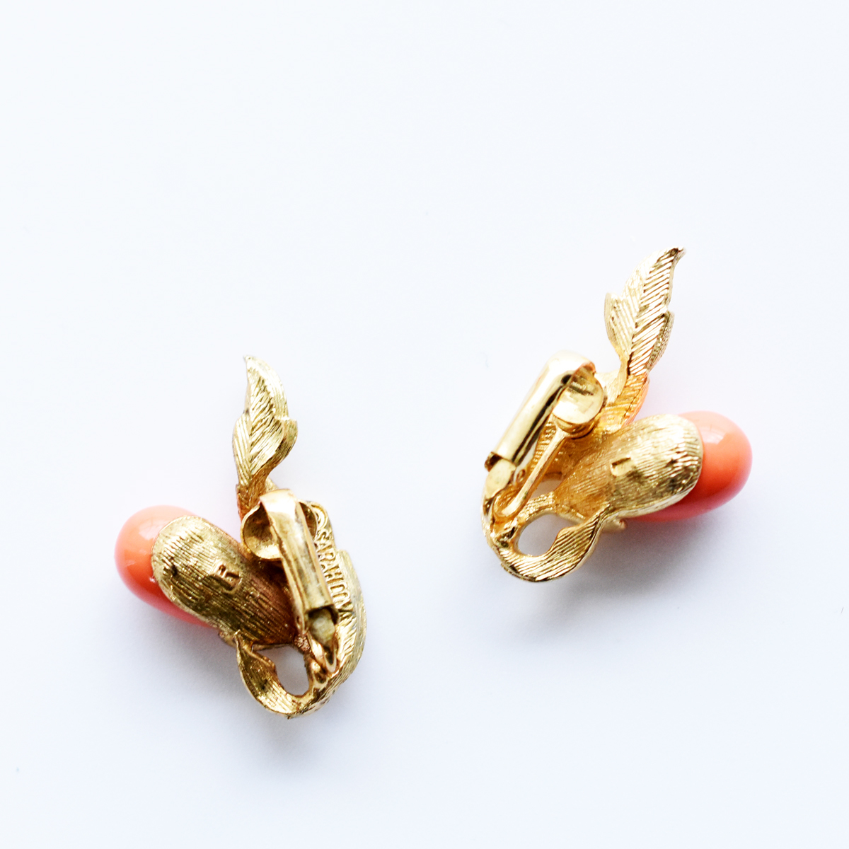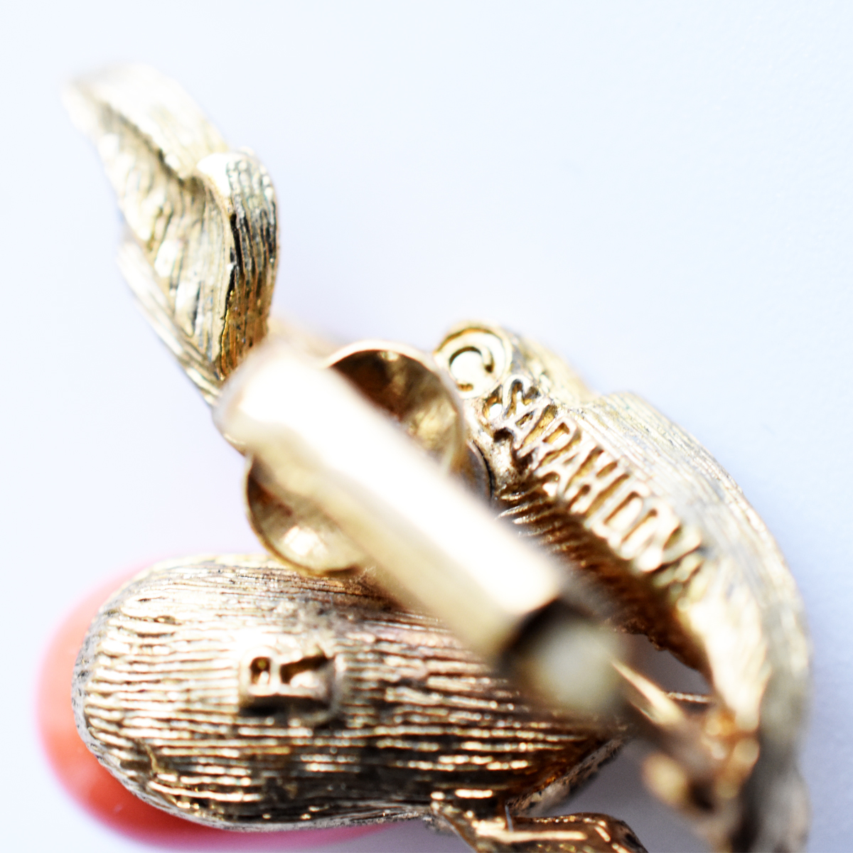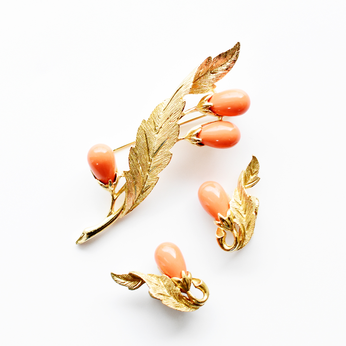 珊瑚を思わせるコーラルカラーのパーツが目を惹くどんぐりモチーフのヴィンテージブローチ&イヤリングです。