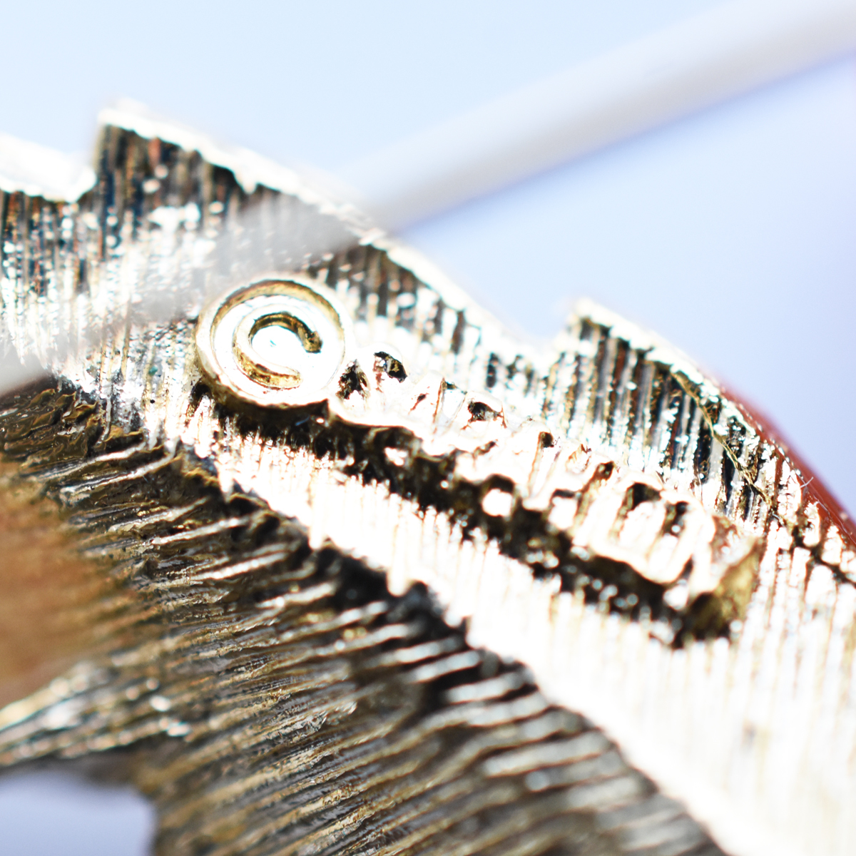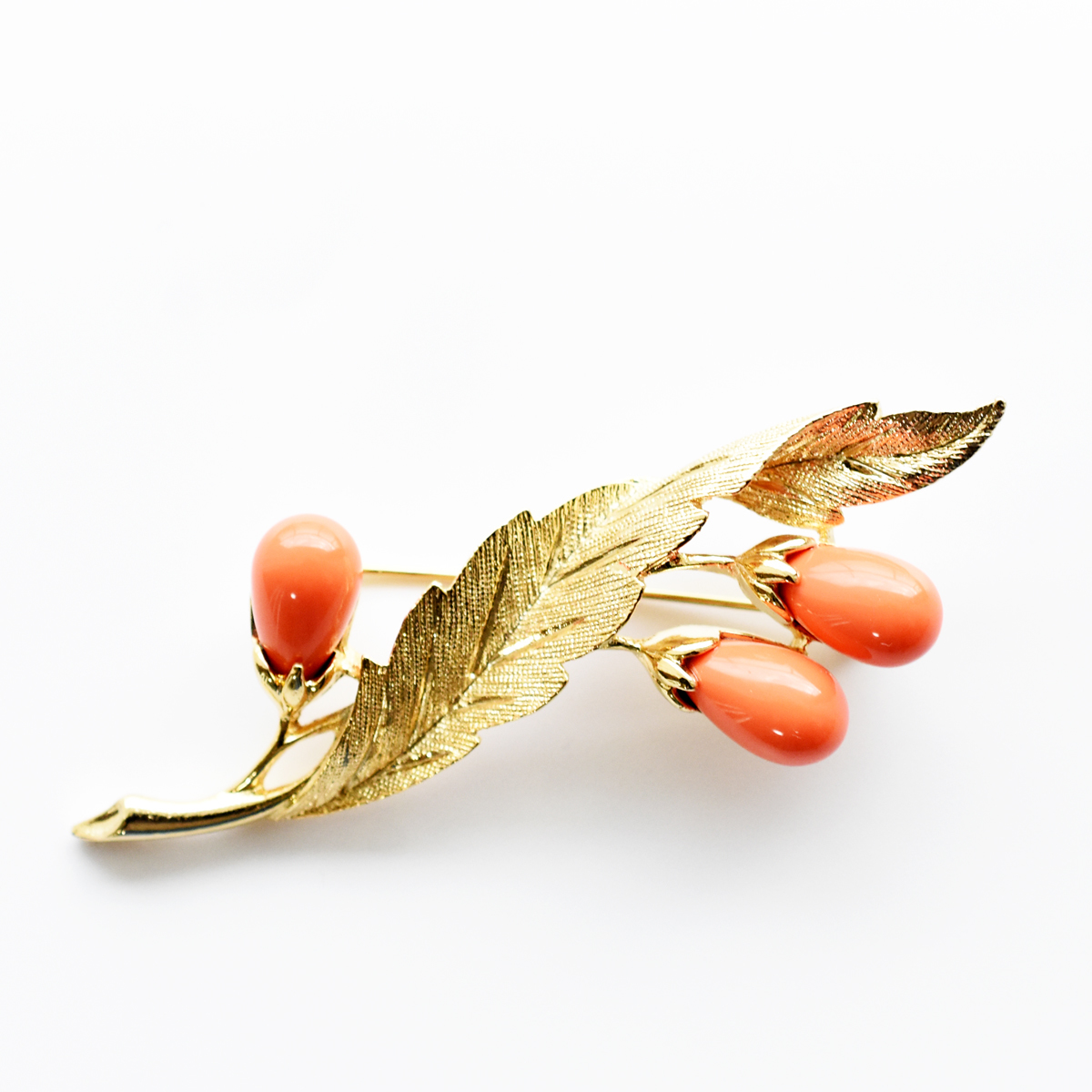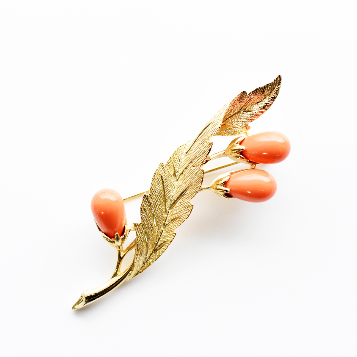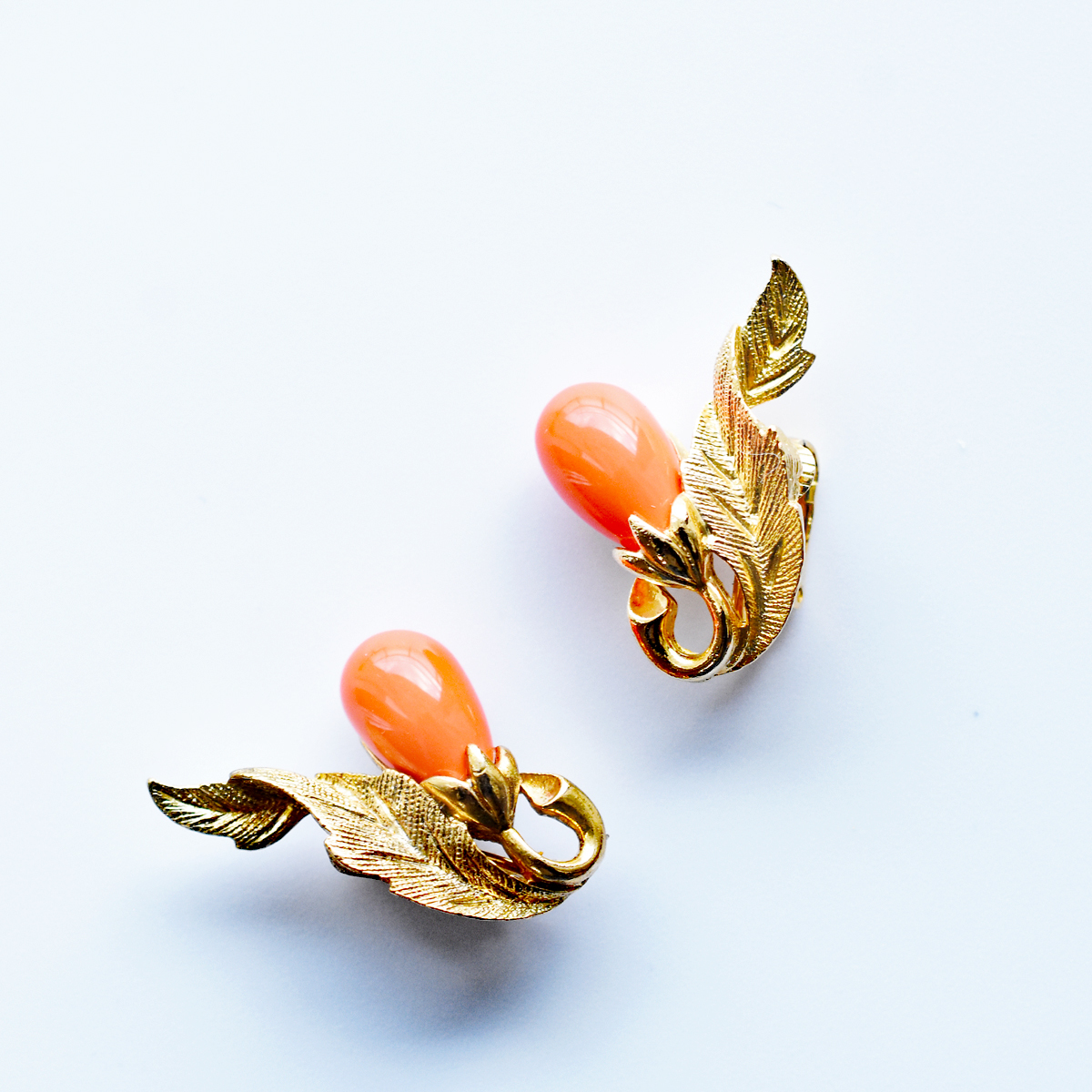 珊瑚を思わせるコーラルカラーのパーツが目を惹くどんぐりモチーフのヴィンテージブローチ&イヤリングです。