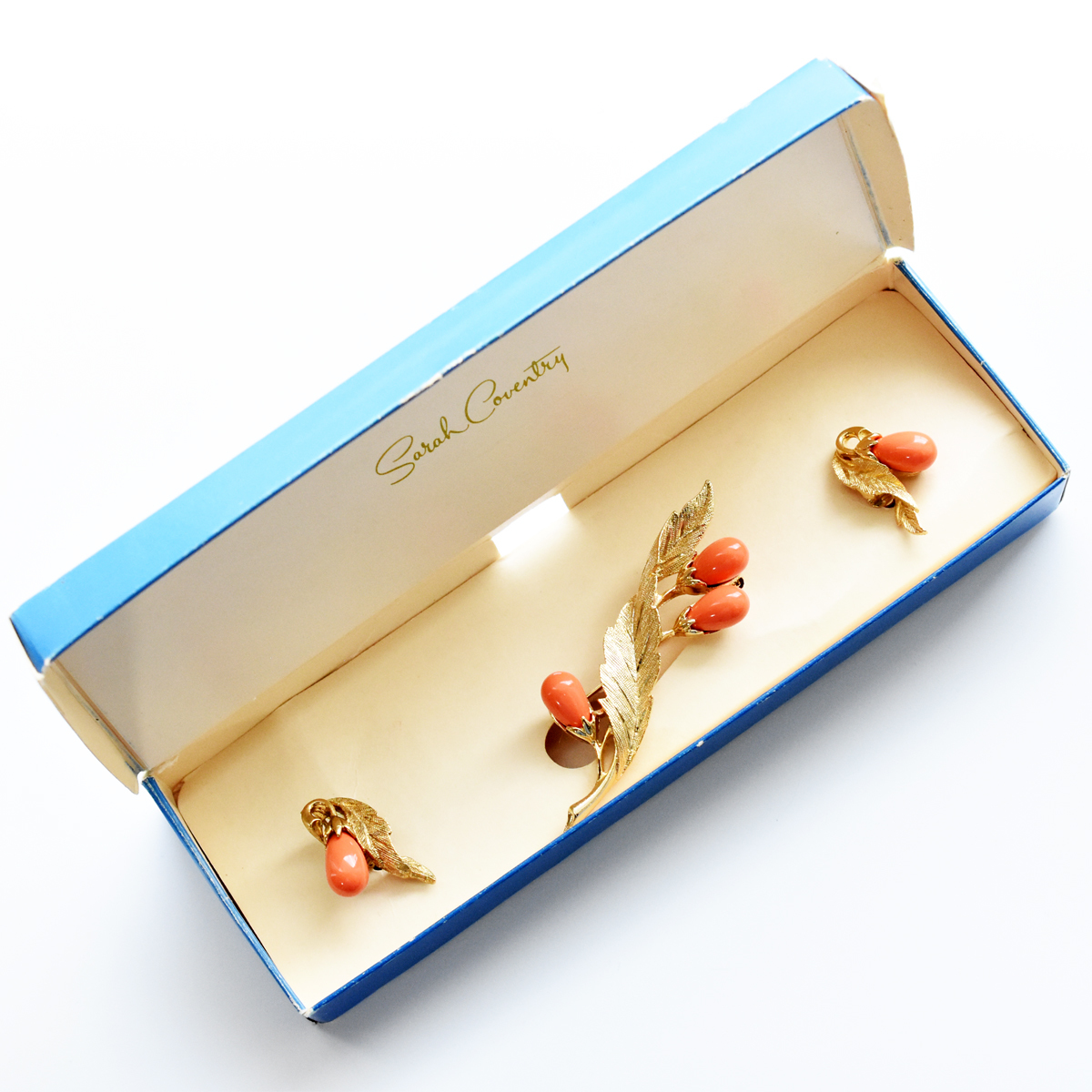 Vintage SARAH COVENTRY 1960’s coral color  Acorn motif brooch&earrings With box  set
