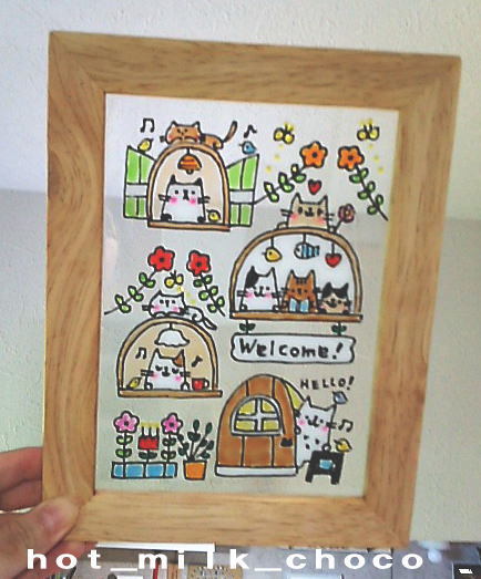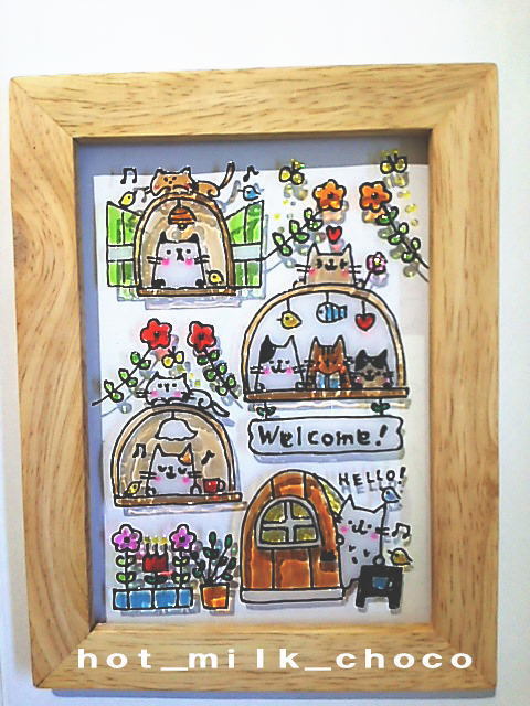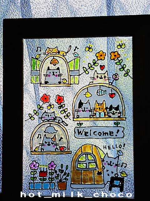 ★NO.L108★ステンドグラス風・2Lサイズ・猫・猫の家・キャットハウス・保護猫・猫カフェ・花・ハンドメイド・雑貨・飾り・イラスト・絵