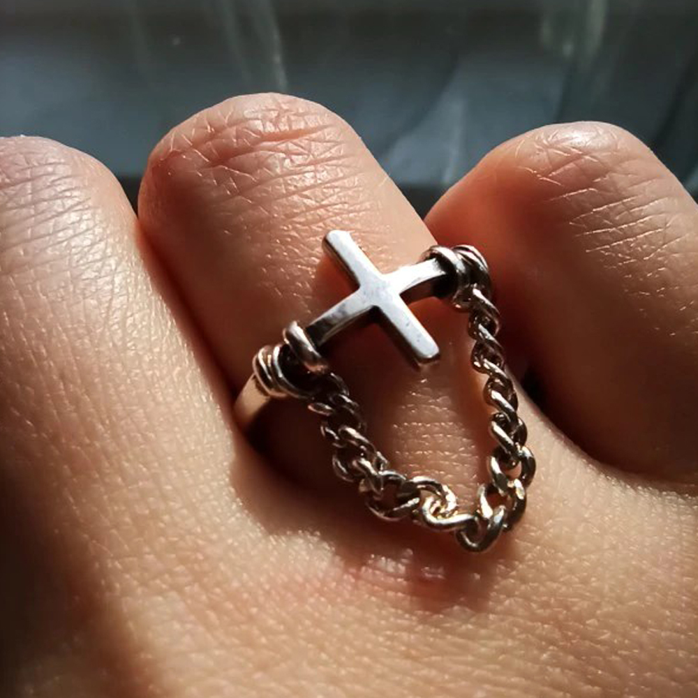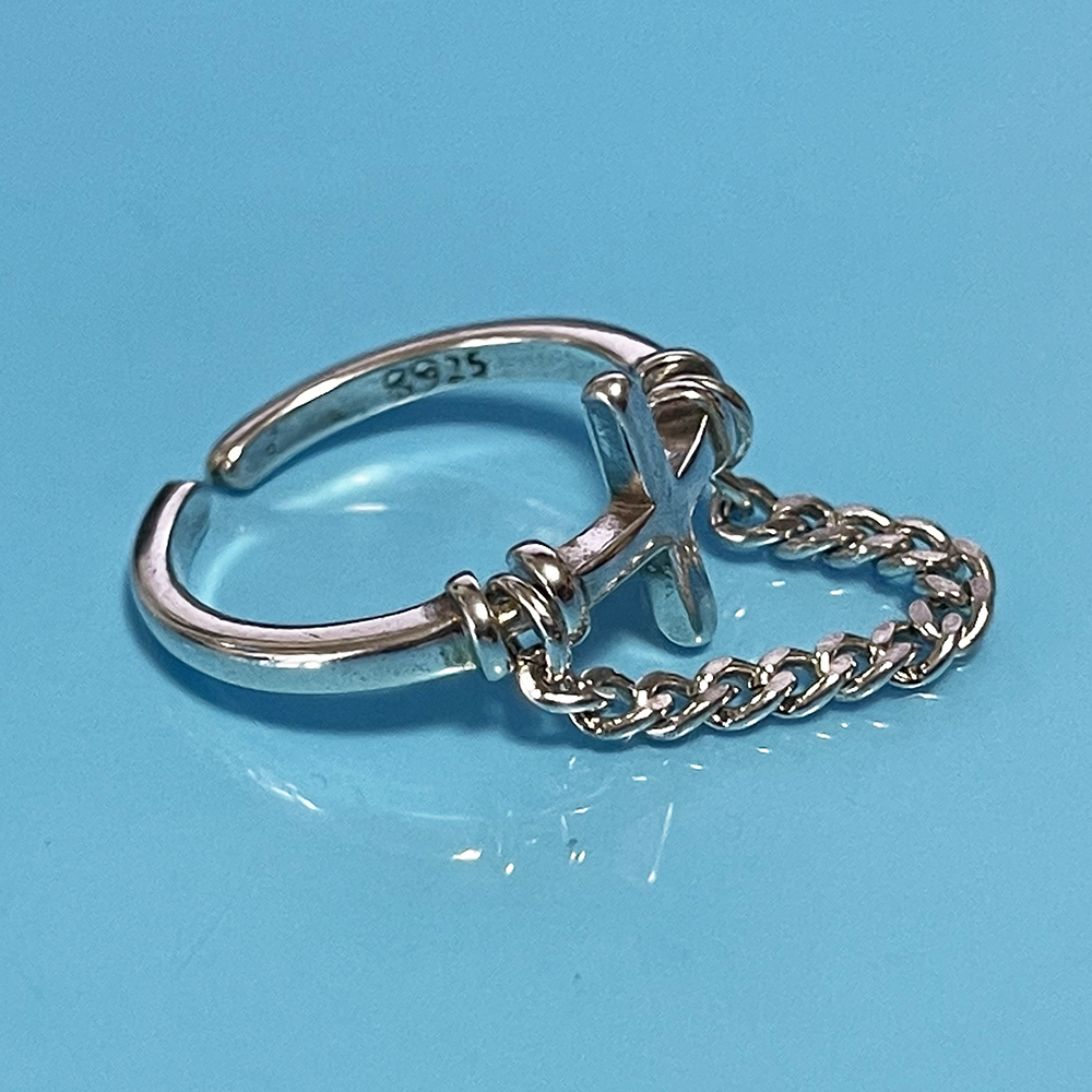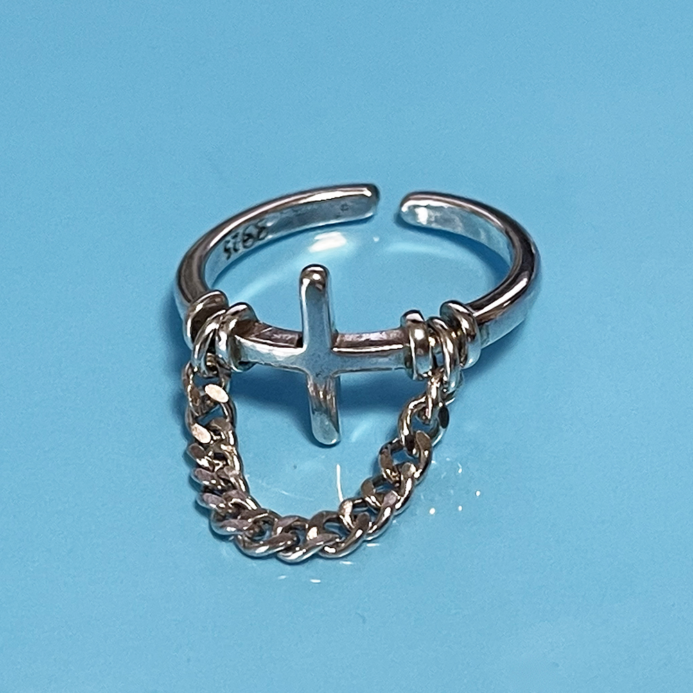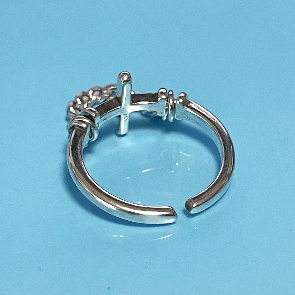 リング シルバー 指輪 レディース クロス チェーン 十字架 アクセサリー 調整可 オープンリング フリーサイズ ジュエリー ロザリオ