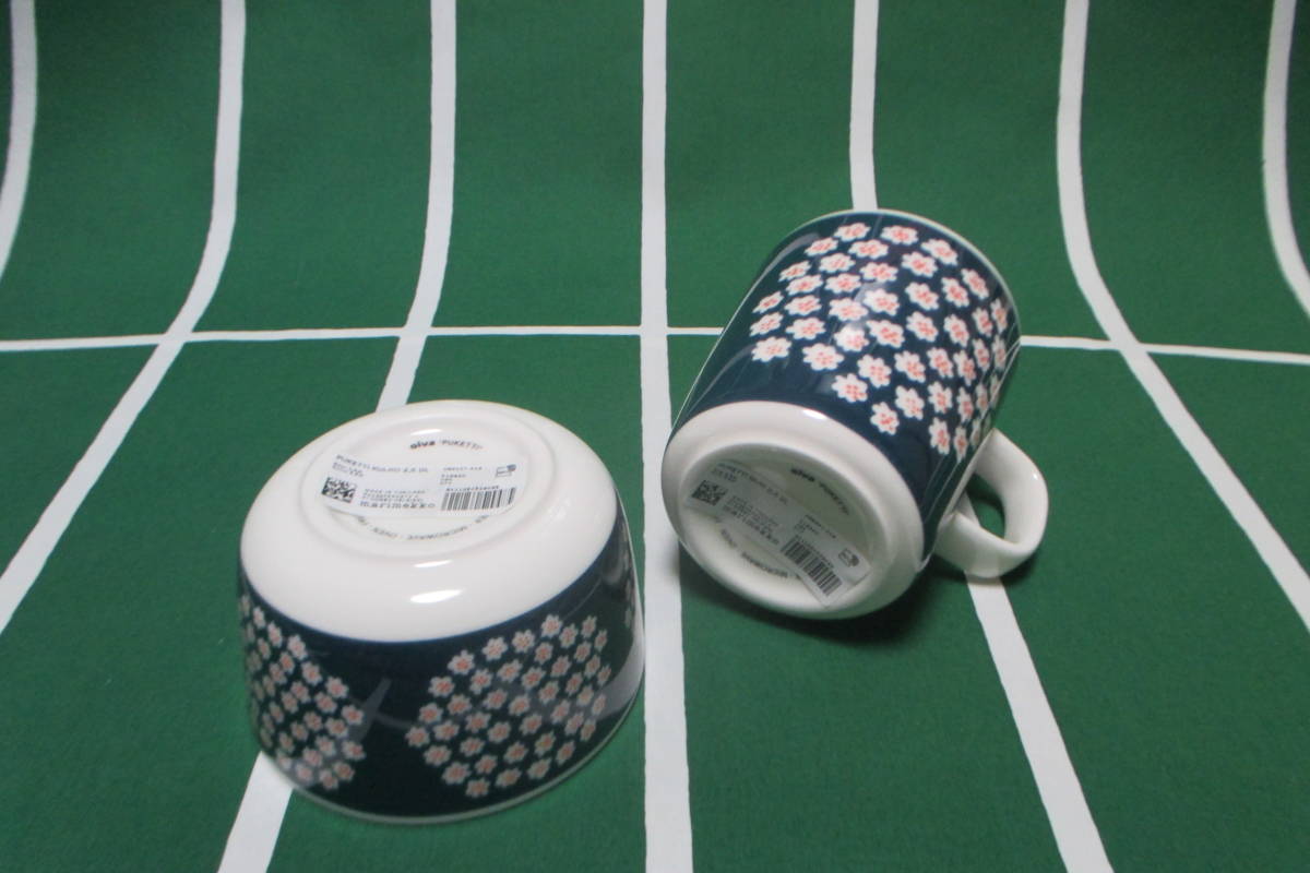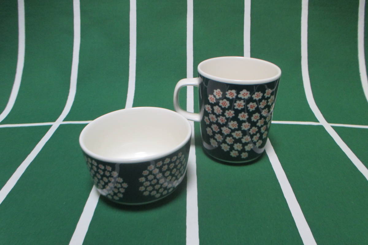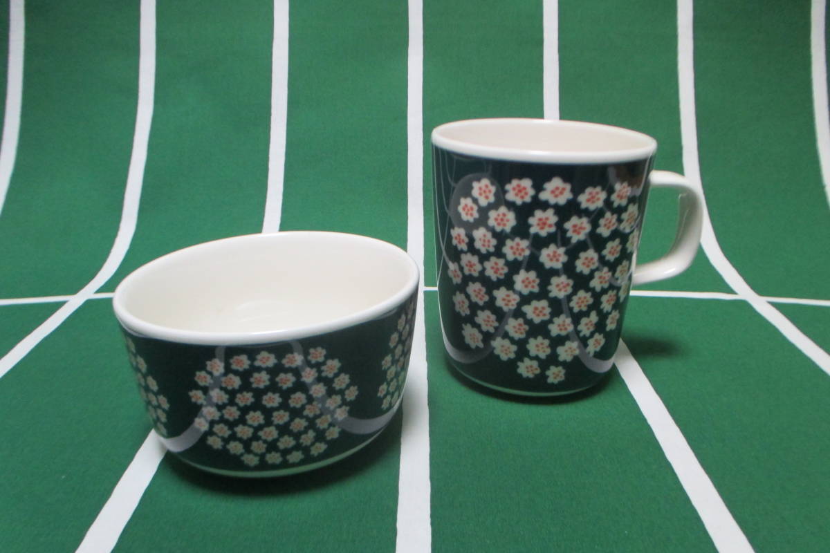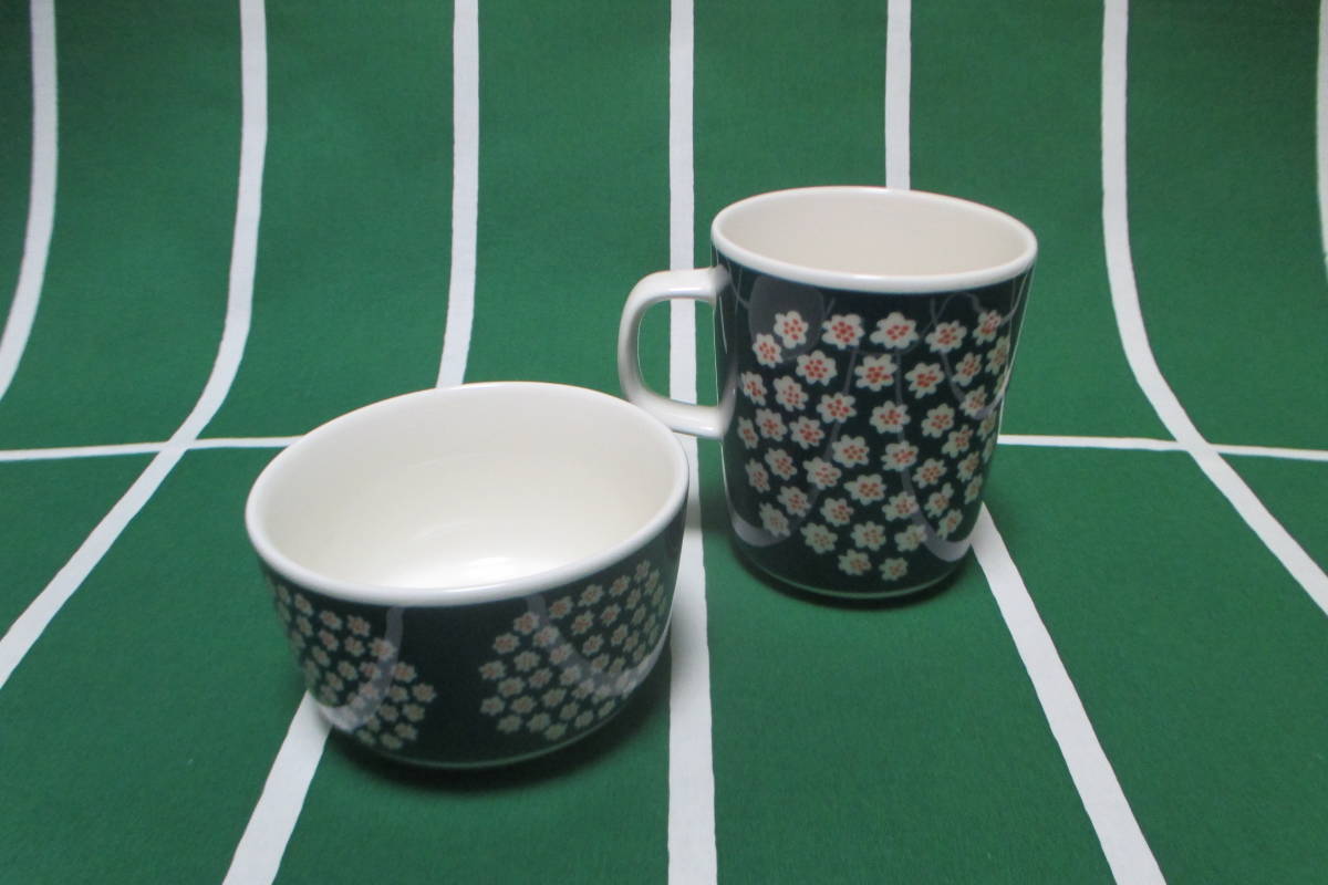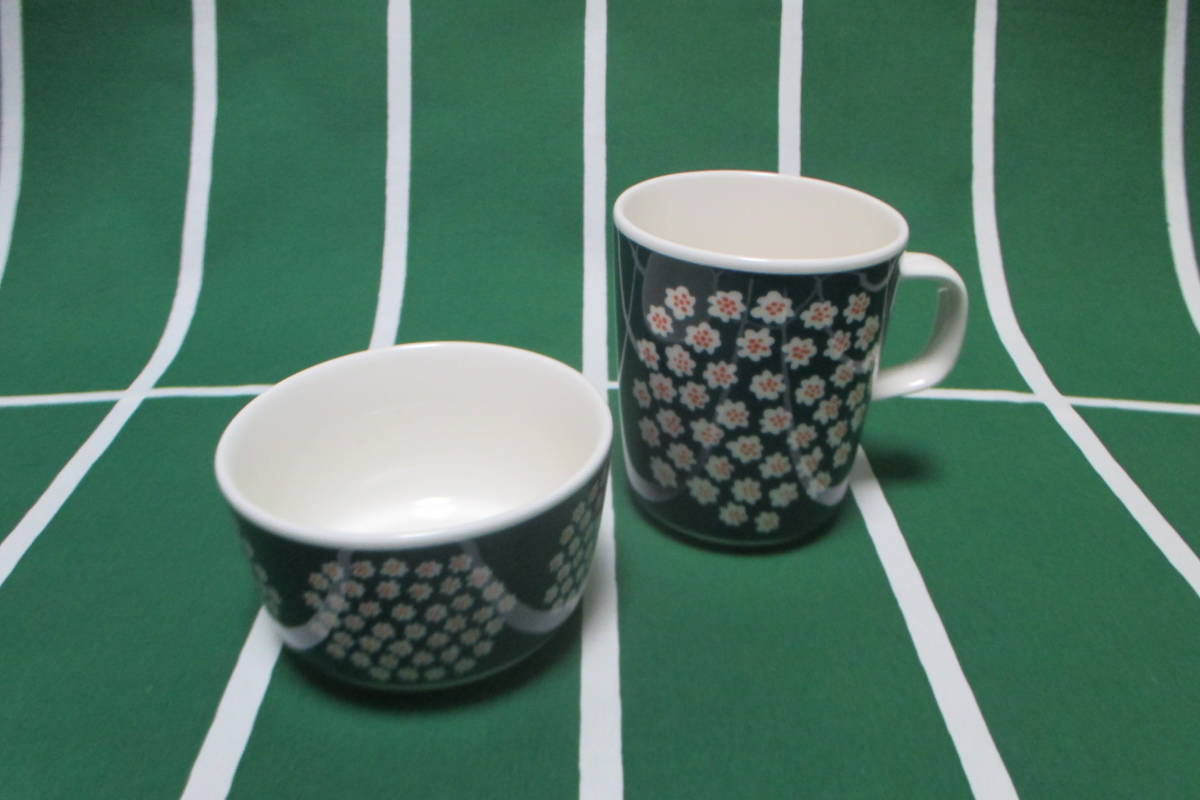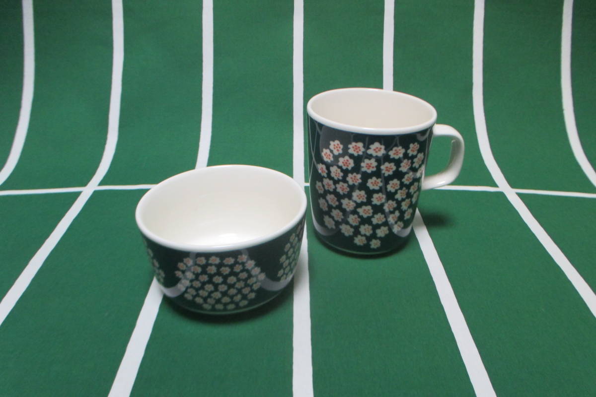 ☆マリメッコ PUKETTI / プケッティのネイビー(花芯: レッド)の マグカップ と ボウルのセットです。