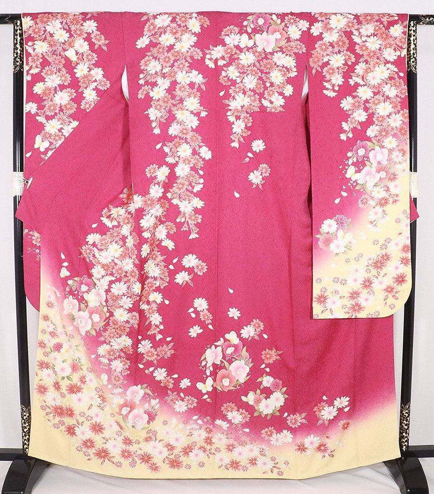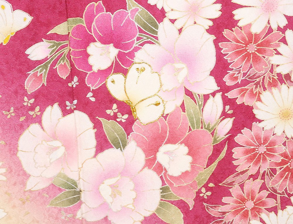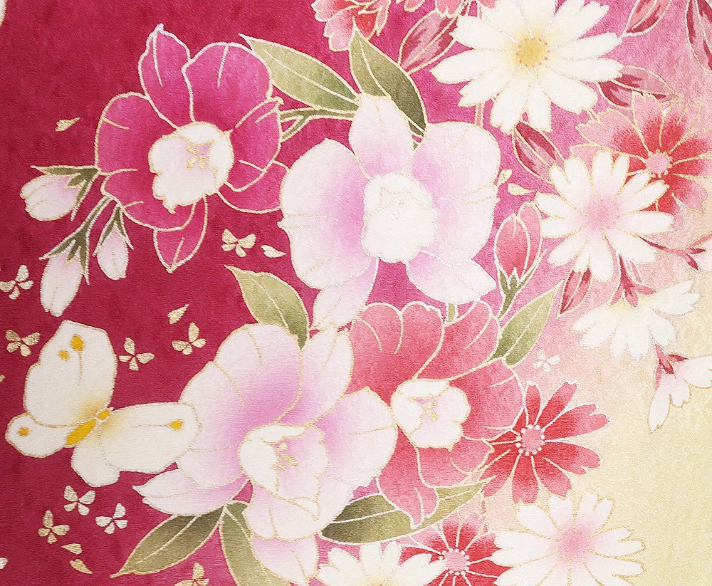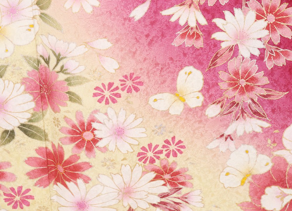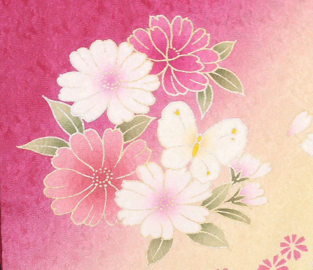 | 色・柄 | 振袖 袷 丹後縮緬地 ローズピンク・黄色暈し地 胡蝶蘭・マーガレット・桜・蝶 (写真では上手く色が出ない場合があります。ご了承下さい) 写真の枚数が多いので一度パソコンでご覧ください。 |