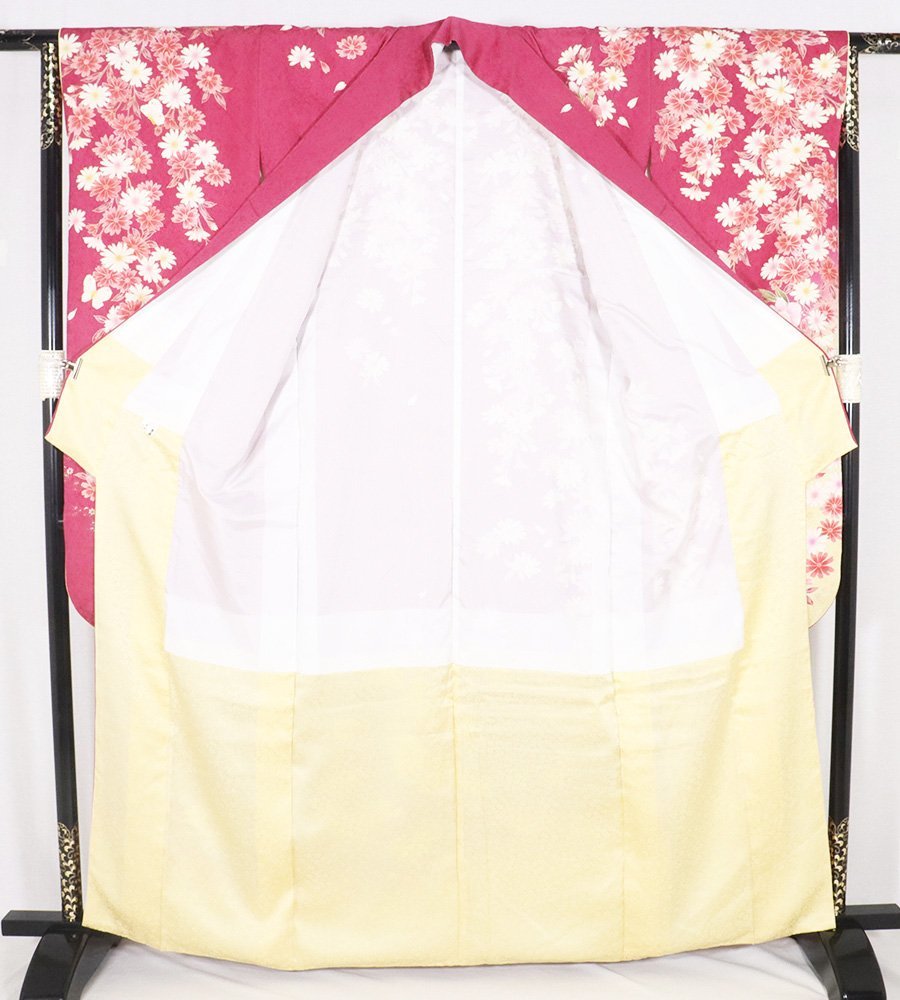 | 振袖 袷 丹後縮緬地 ローズピンク・黄色暈し地 胡蝶蘭・マーガレット・桜・蝶 170 広襟 | |