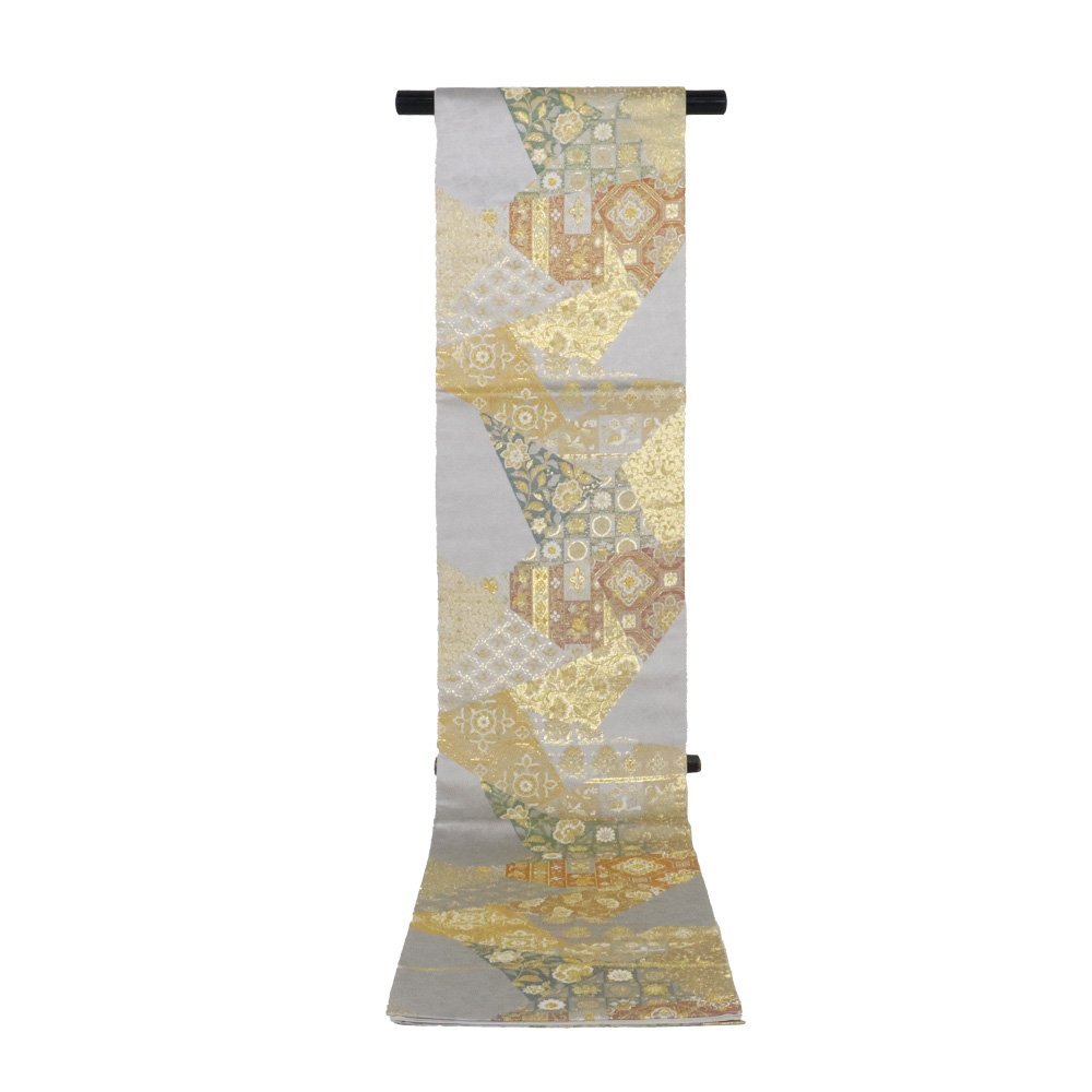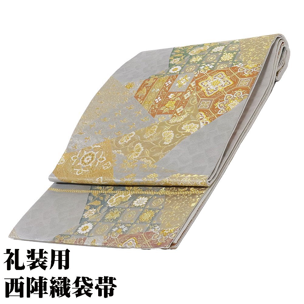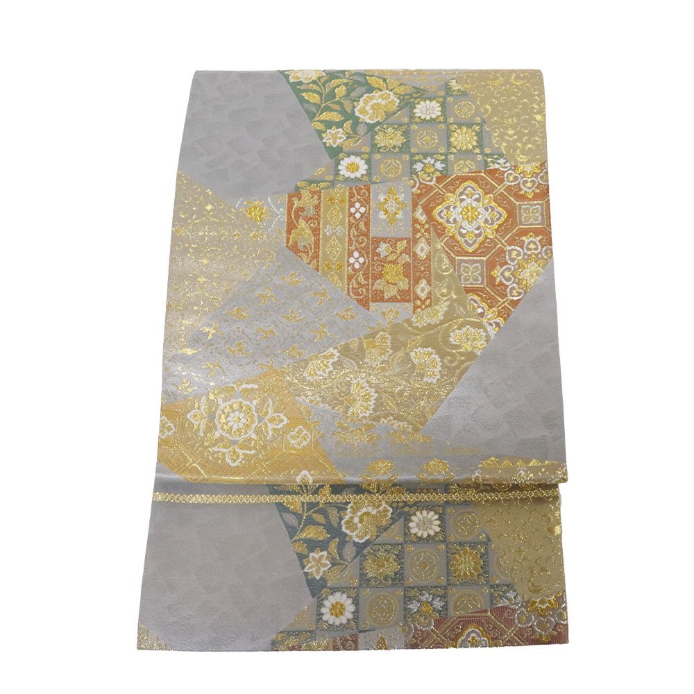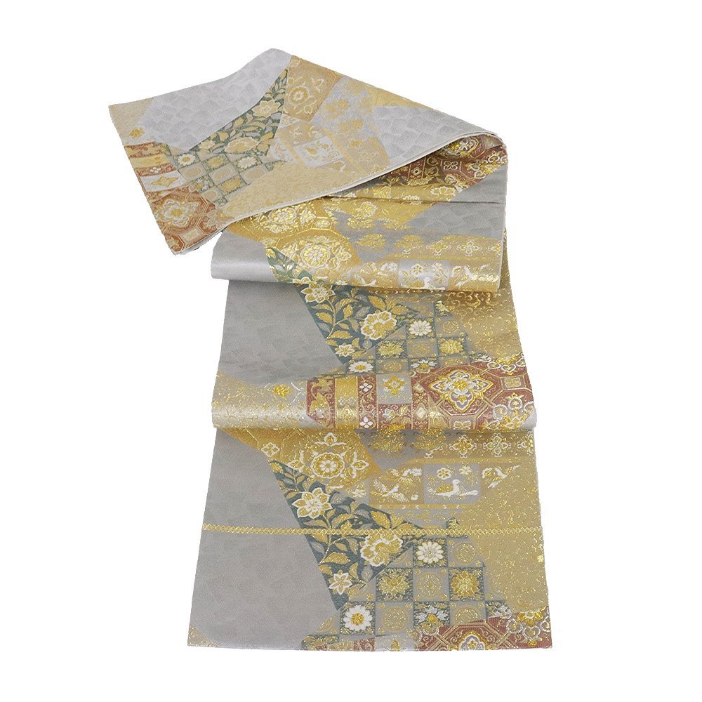 | 西陣織袋帯 銀・格子・金箔地 正倉院文様 華文・唐花・裂取文 鳥・菊・笹蔓 新品 仕立て上がり |