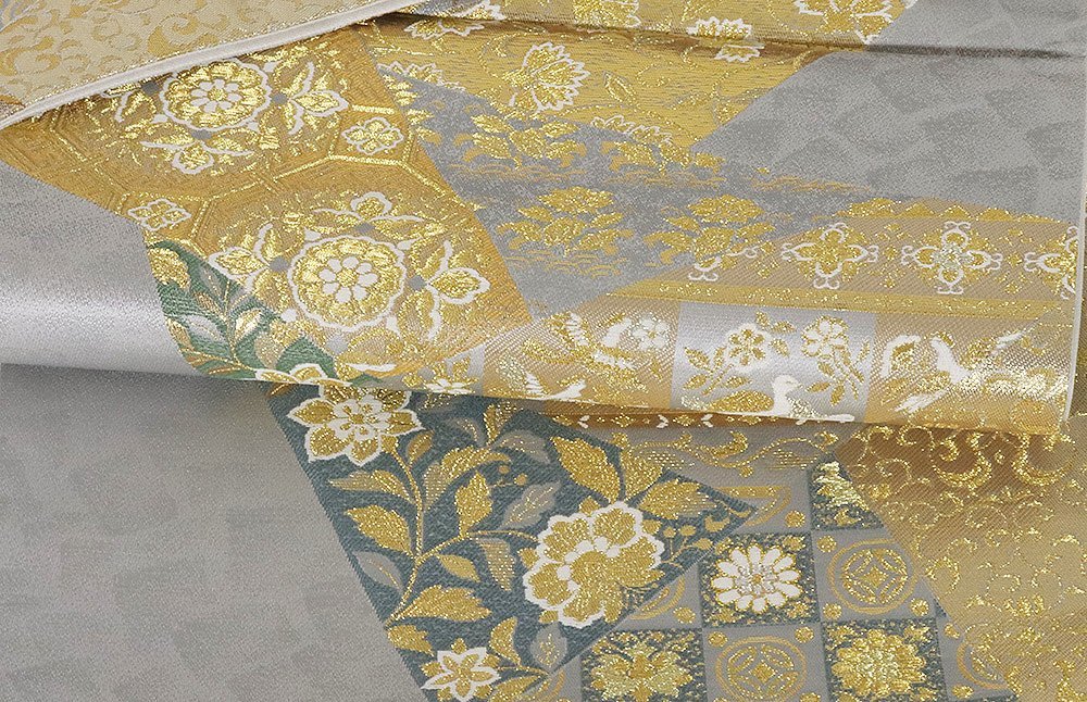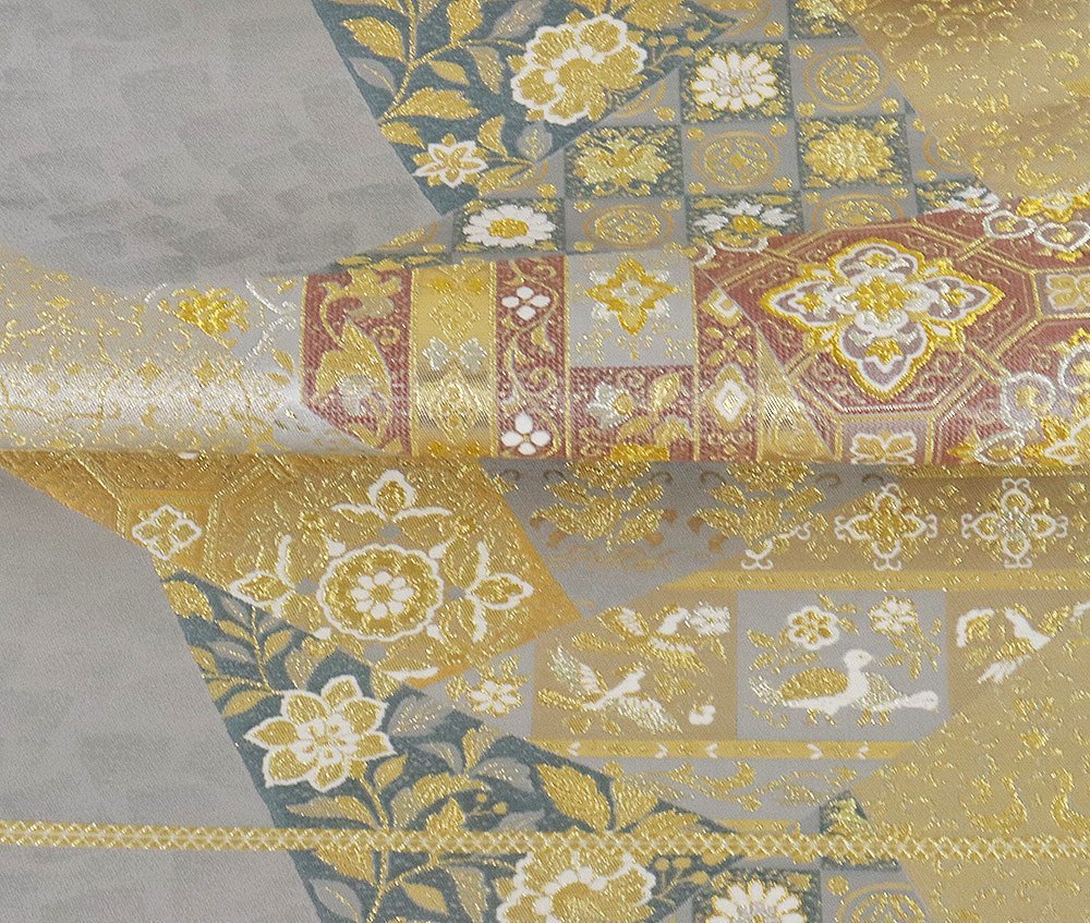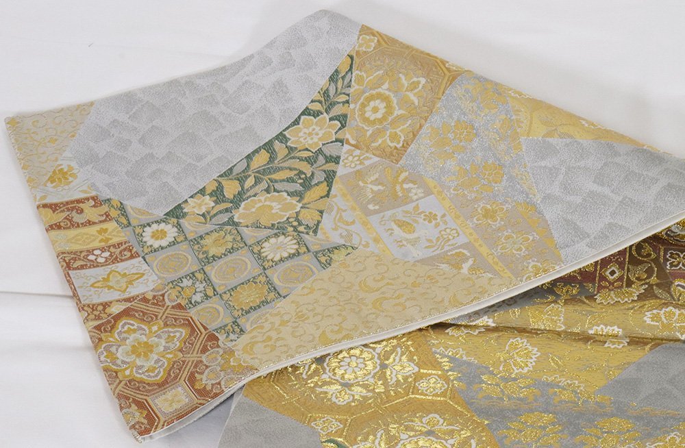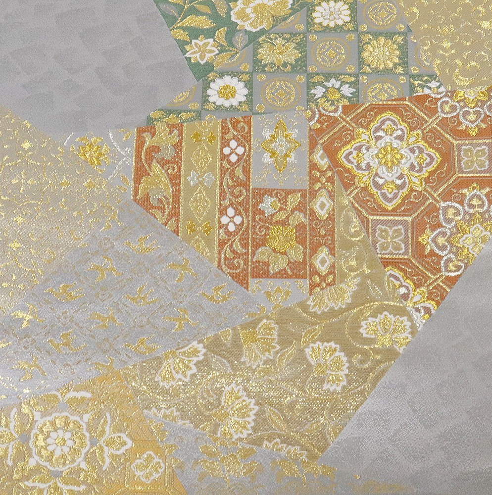 | 西陣織袋帯 銀・格子・金箔地 正倉院文様 華文・唐花・裂取文 鳥・菊・笹蔓 新品 仕立て上がり |