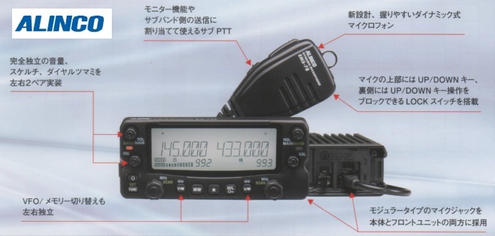 電波型式 | F3E / A3E(受信のみ)/ F1E(アルインコ方式GMSK/オプション) |