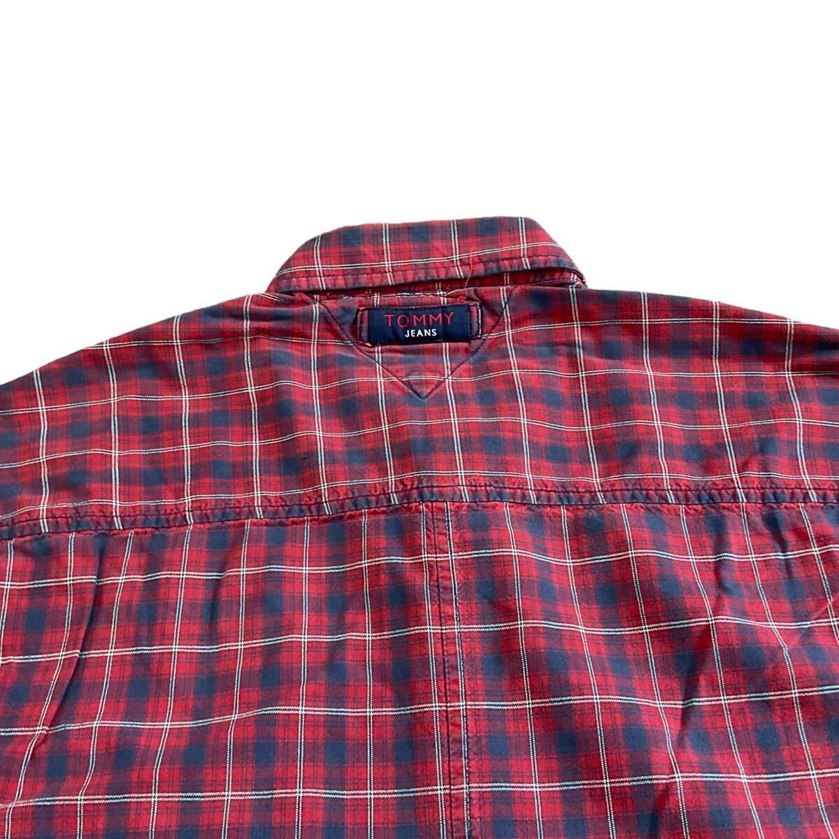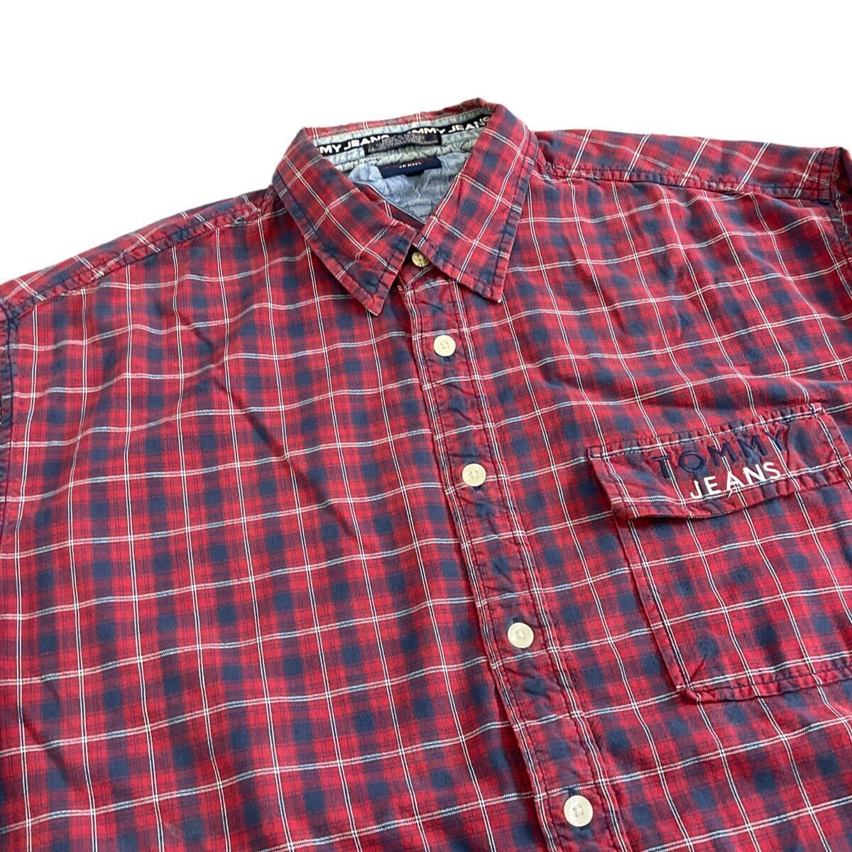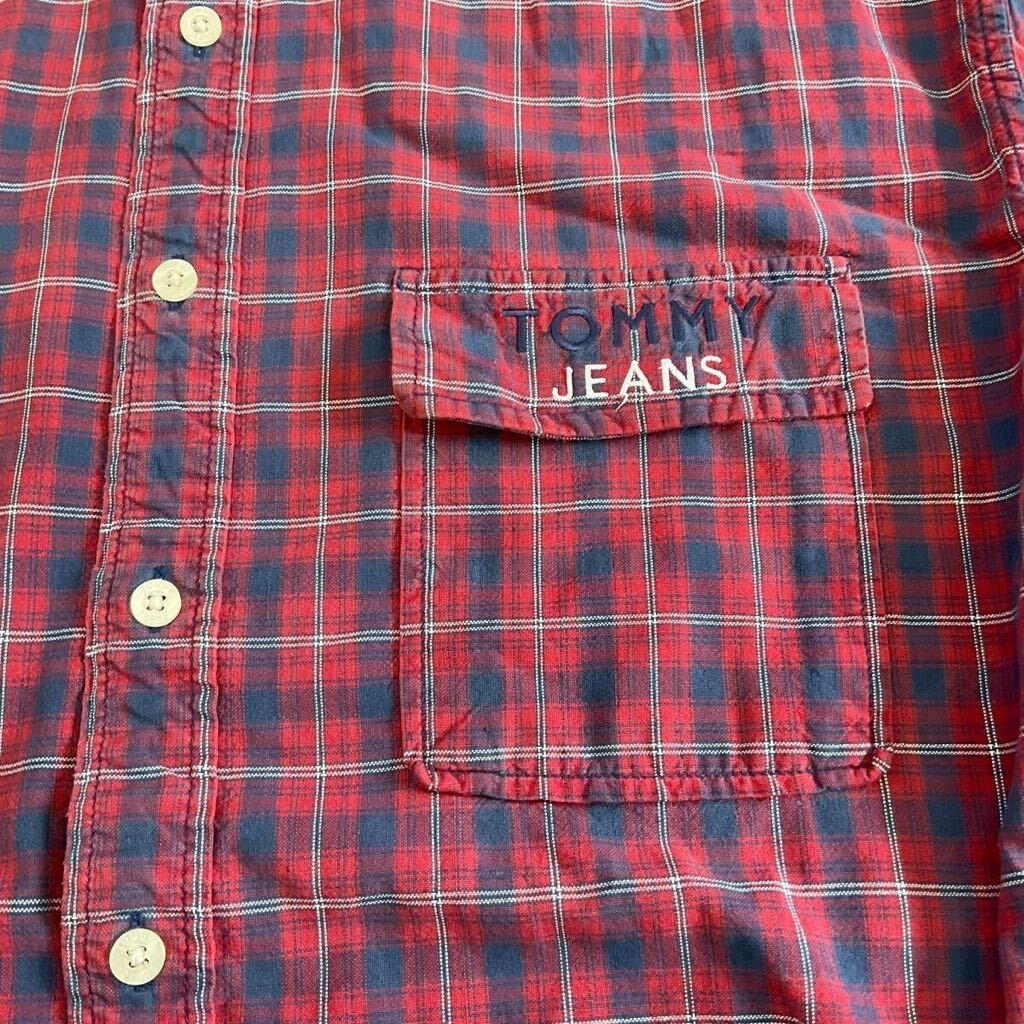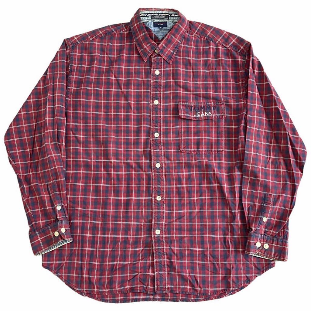 90s TOMMY JEANS 長袖 ボタンシャツ XL レッド チェック シャツ ロゴ 刺繍 トミージーンズ TOMMY HILFIGER トミーヒルフィガー
