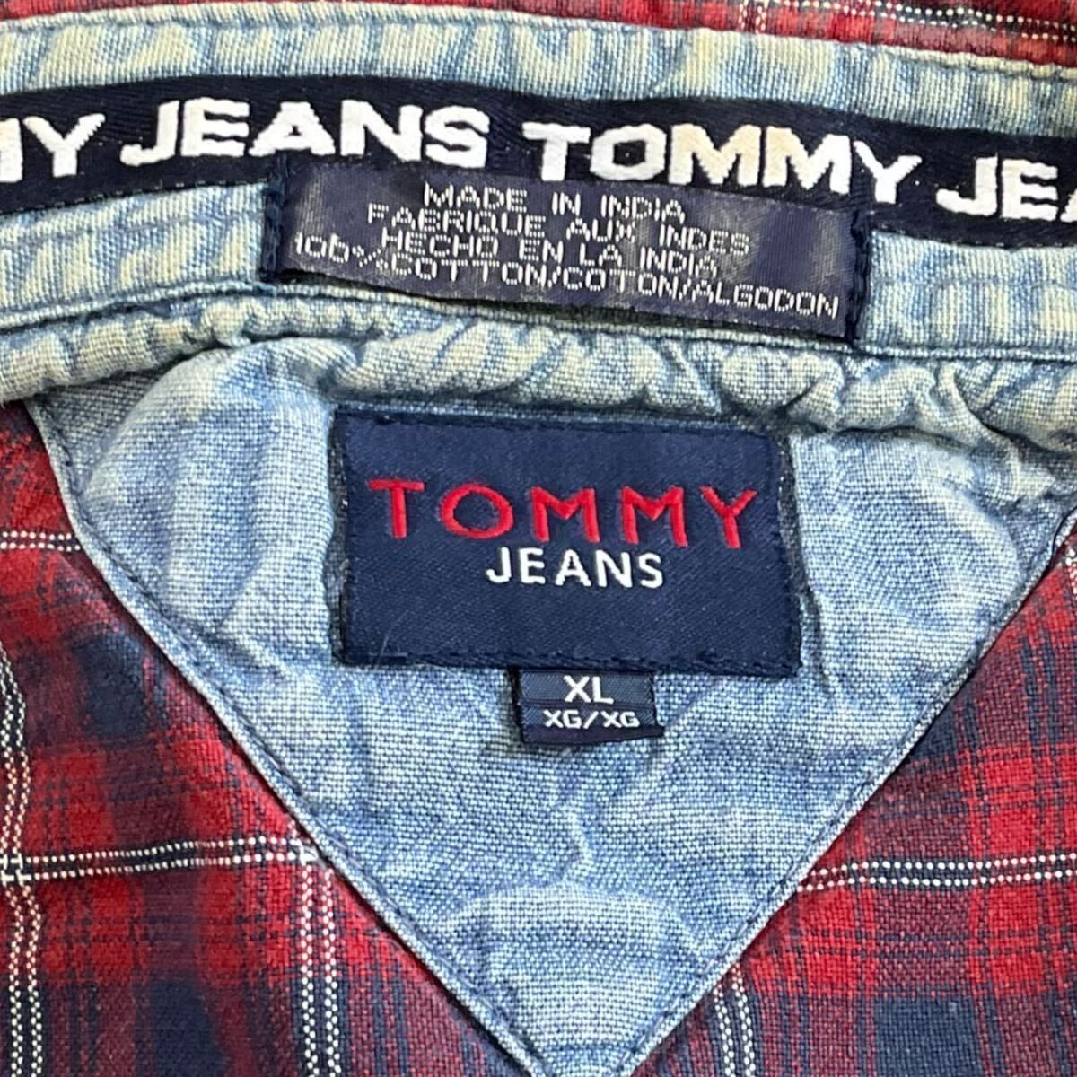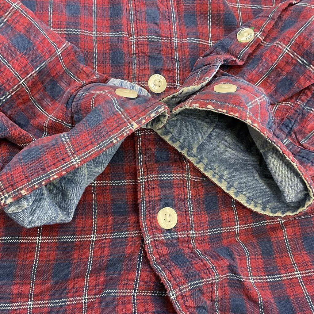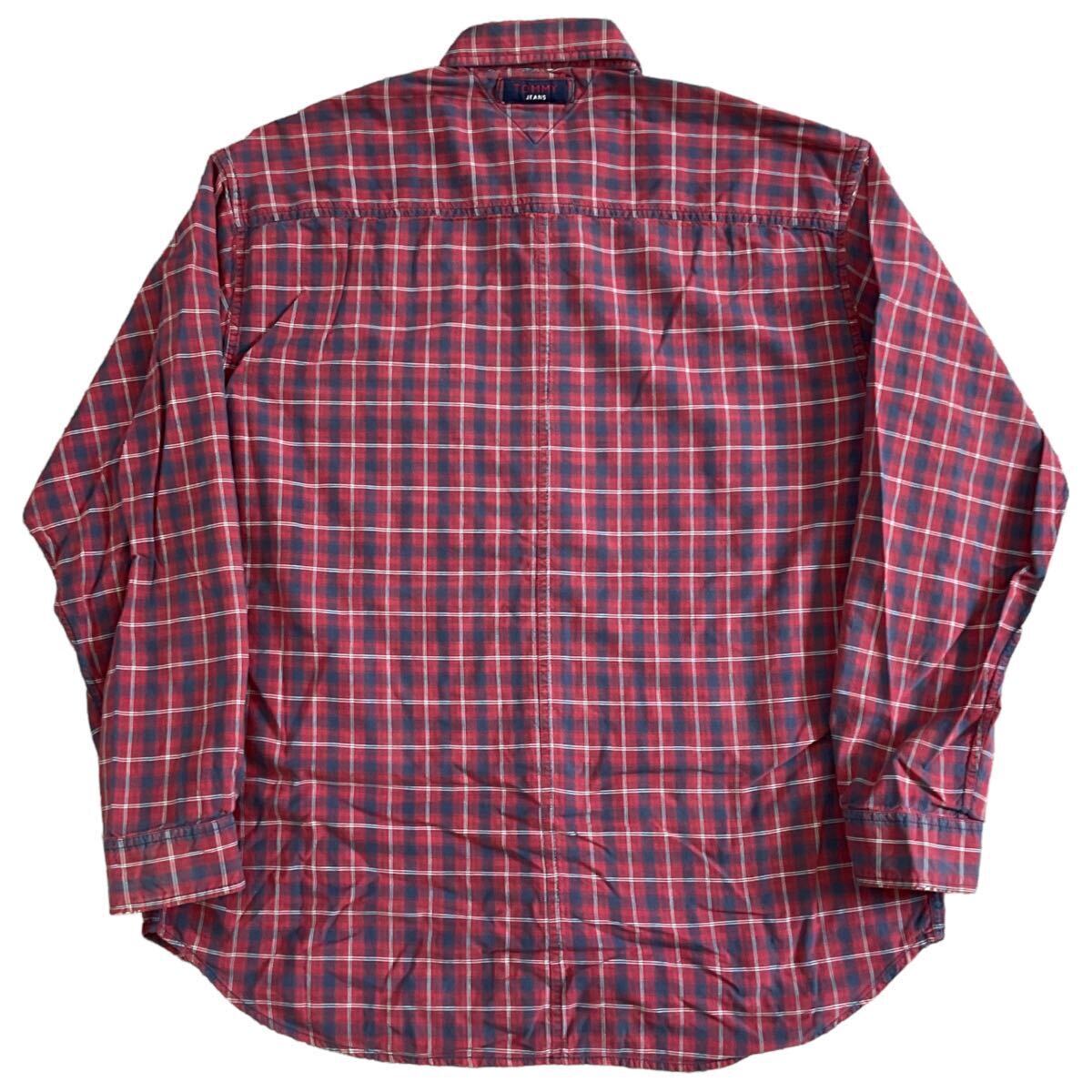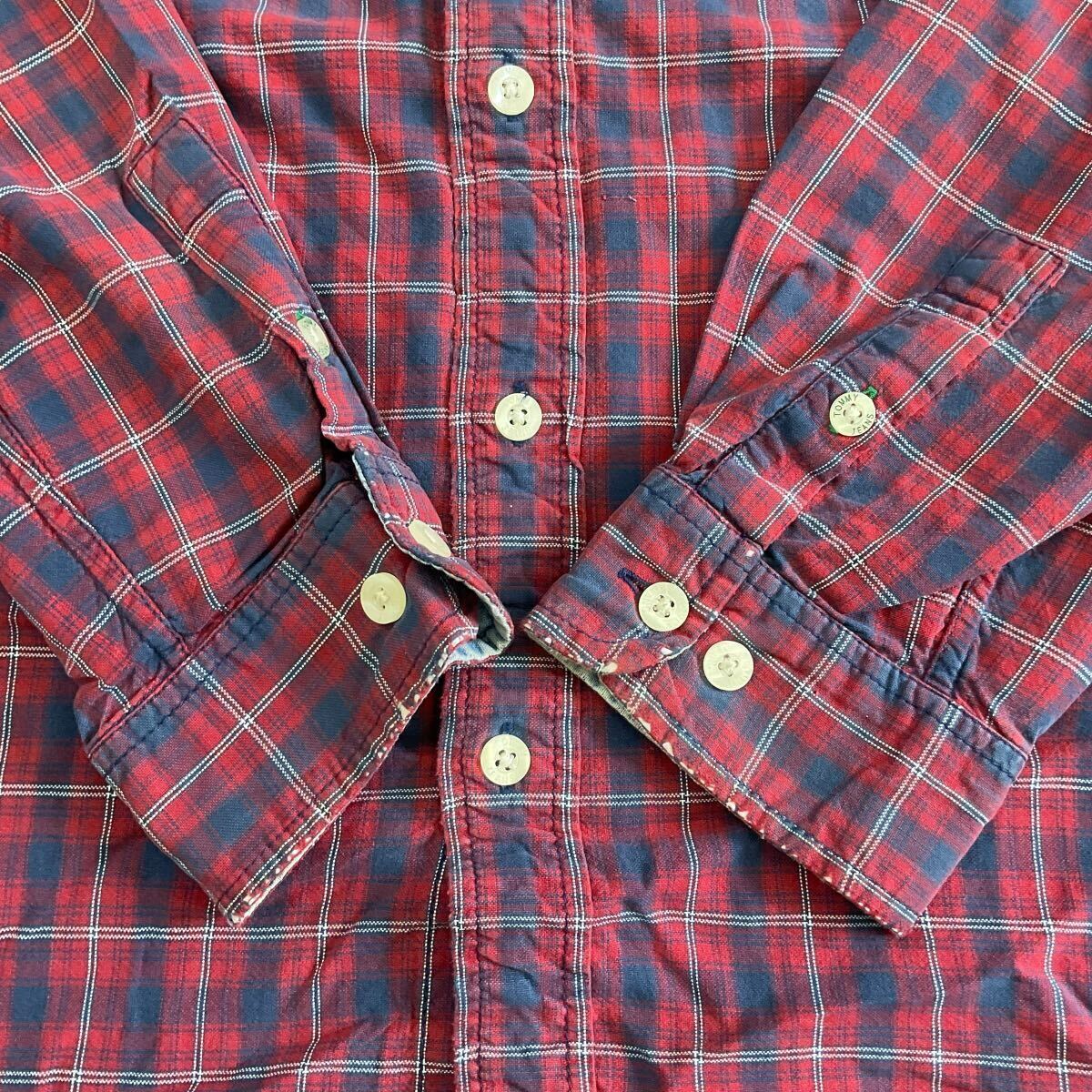 90s TOMMY JEANS 長袖 ボタンシャツ XL レッド チェック シャツ ロゴ 刺繍 トミージーンズ TOMMY HILFIGER トミーヒルフィガー