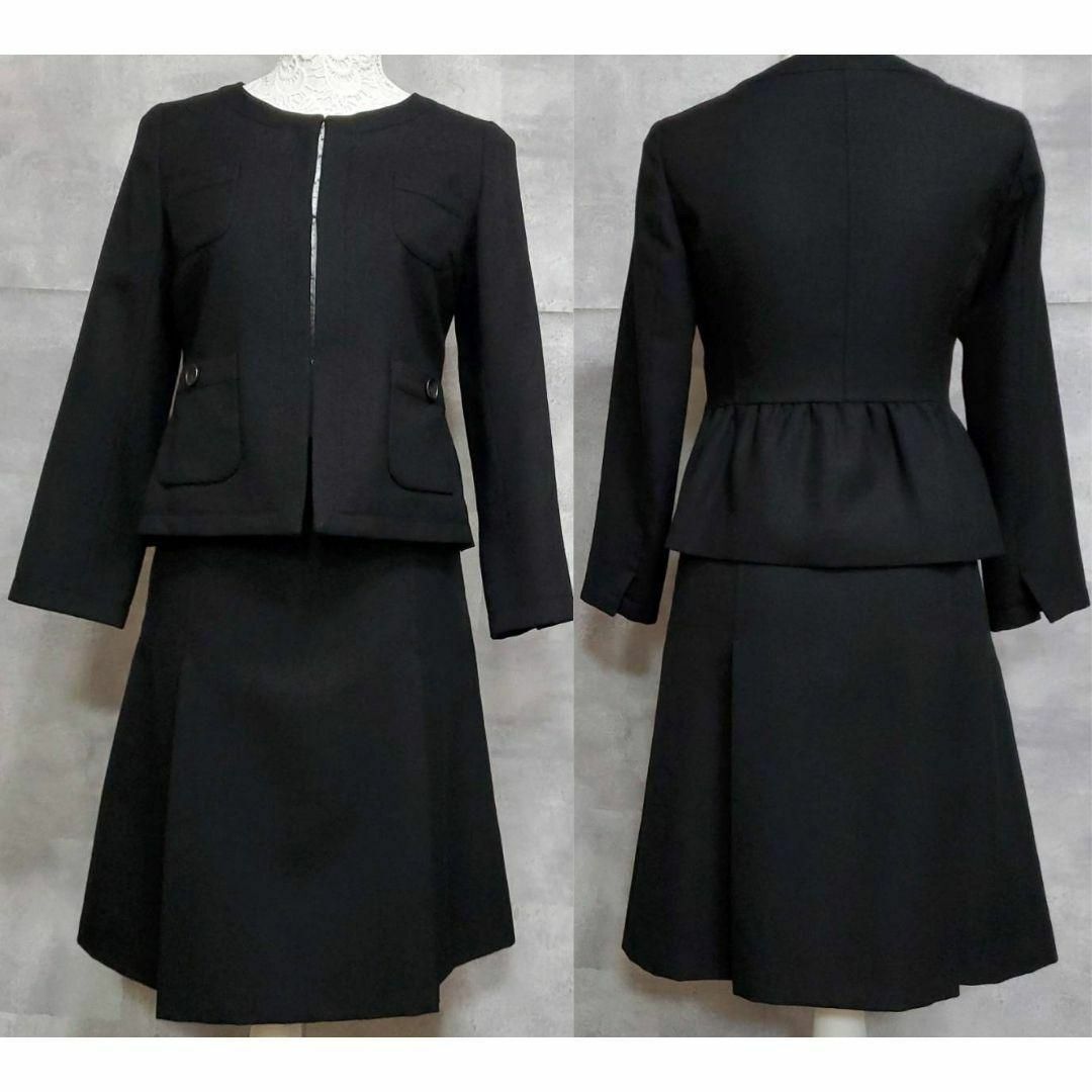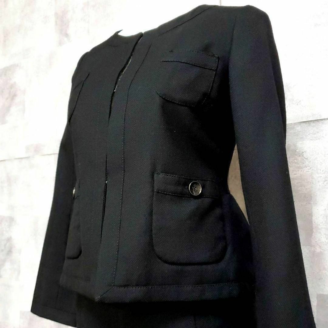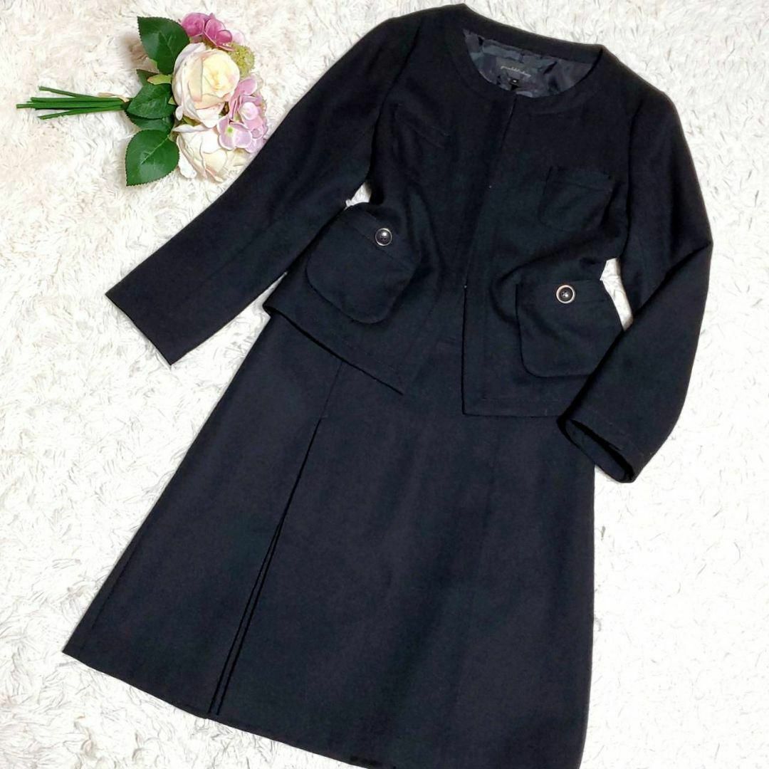 美品 M グリーンレーベルリラクシング ウール100 スカート ノーカラー ジャケット セットアップ 黒 green label relaxing 上下 ジャケット 羊毛 ブラック ボックスプリーツ ひざ丈 カラーレス ユナイテッドアローズ United Arrows