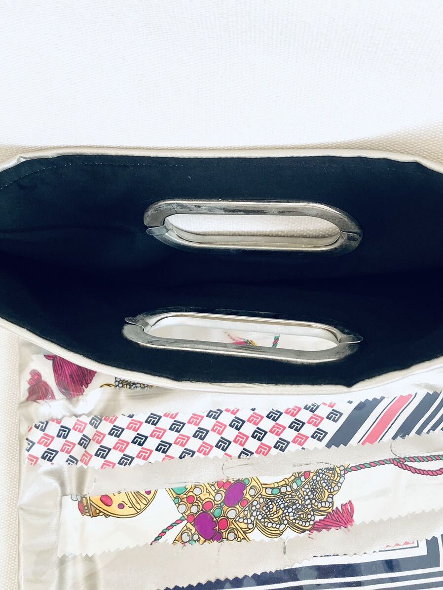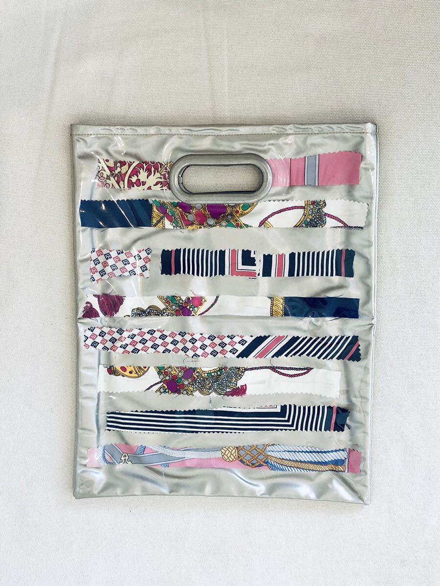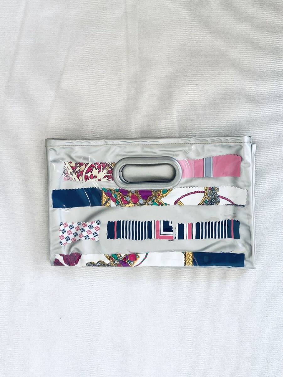 人気ブロガー・ミランダかあちゃんプロデュースブランド・スタイル04のオリジナルバッグ。表は華やかなヴィンテージスカーフが並べられたPVCバッグ。コラージュされたスカーフにより出来上がりの違う一点物です。裏はシンプルなシャンパンゴールドの合皮。気分や用途によって、表裏・トートで持ったり、折りたたんでクラッチにしたりと、持ち方で雰囲気を変えることができます。日常にも、ちょっとしたパーティーにも。美しい色出しとソフトな素材感が素敵。未使用保管品。