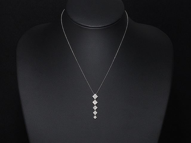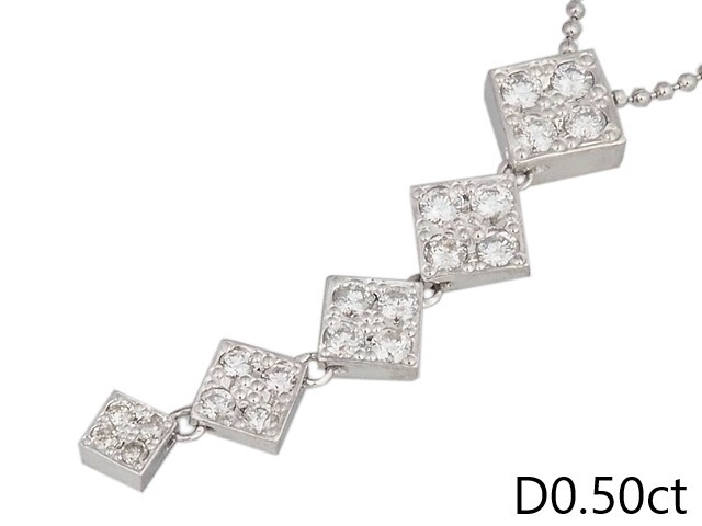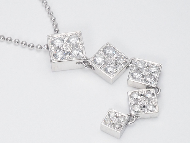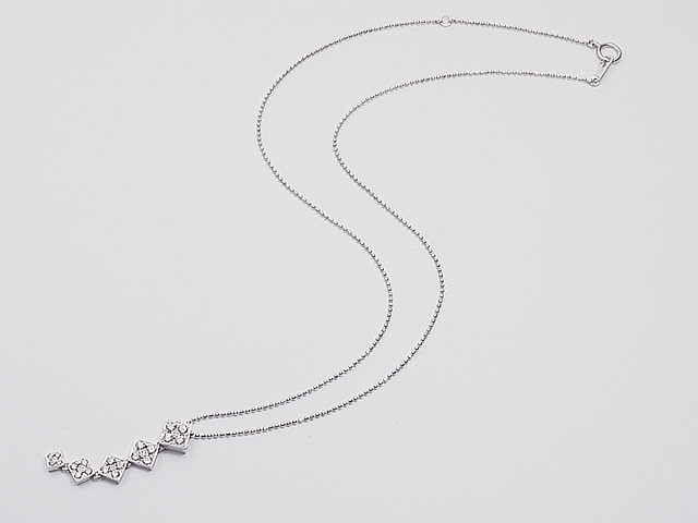 ダイヤモンドをセットしたスクエアモチーフを連ねた、18金ホワイトゴールド製のスタイリッシュなネックレスです。