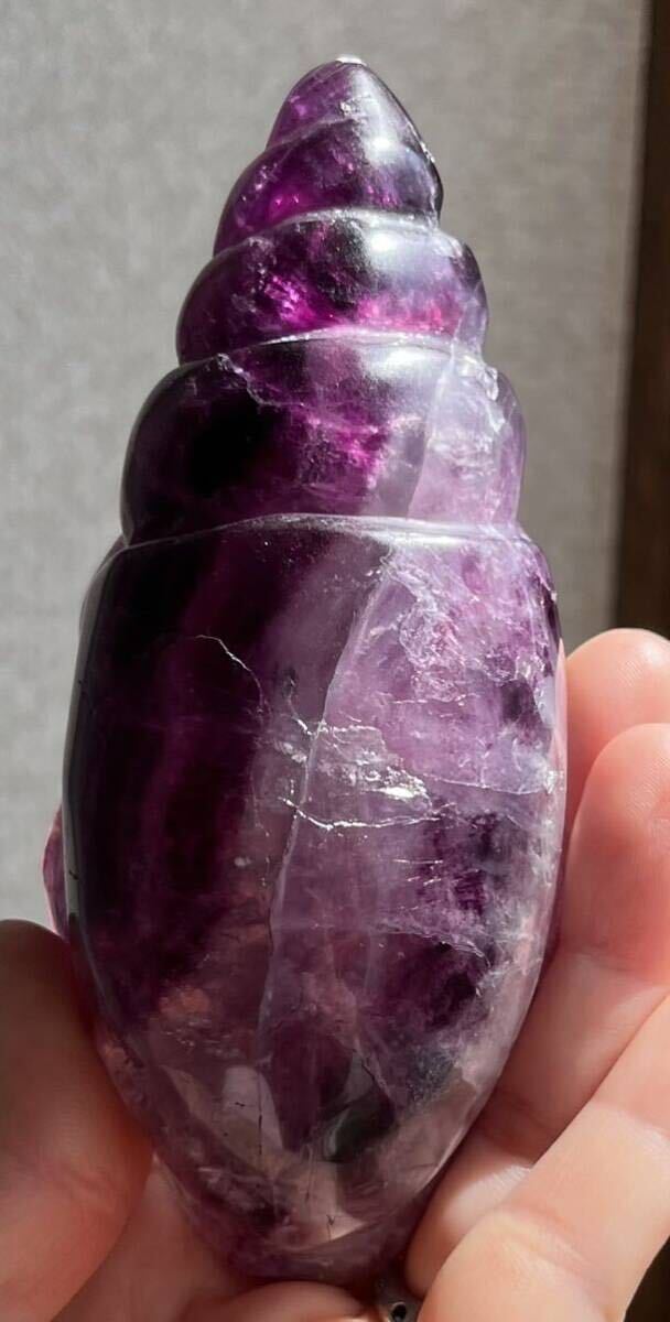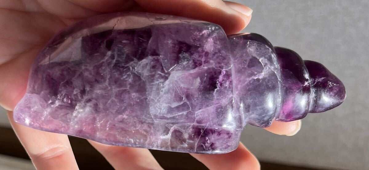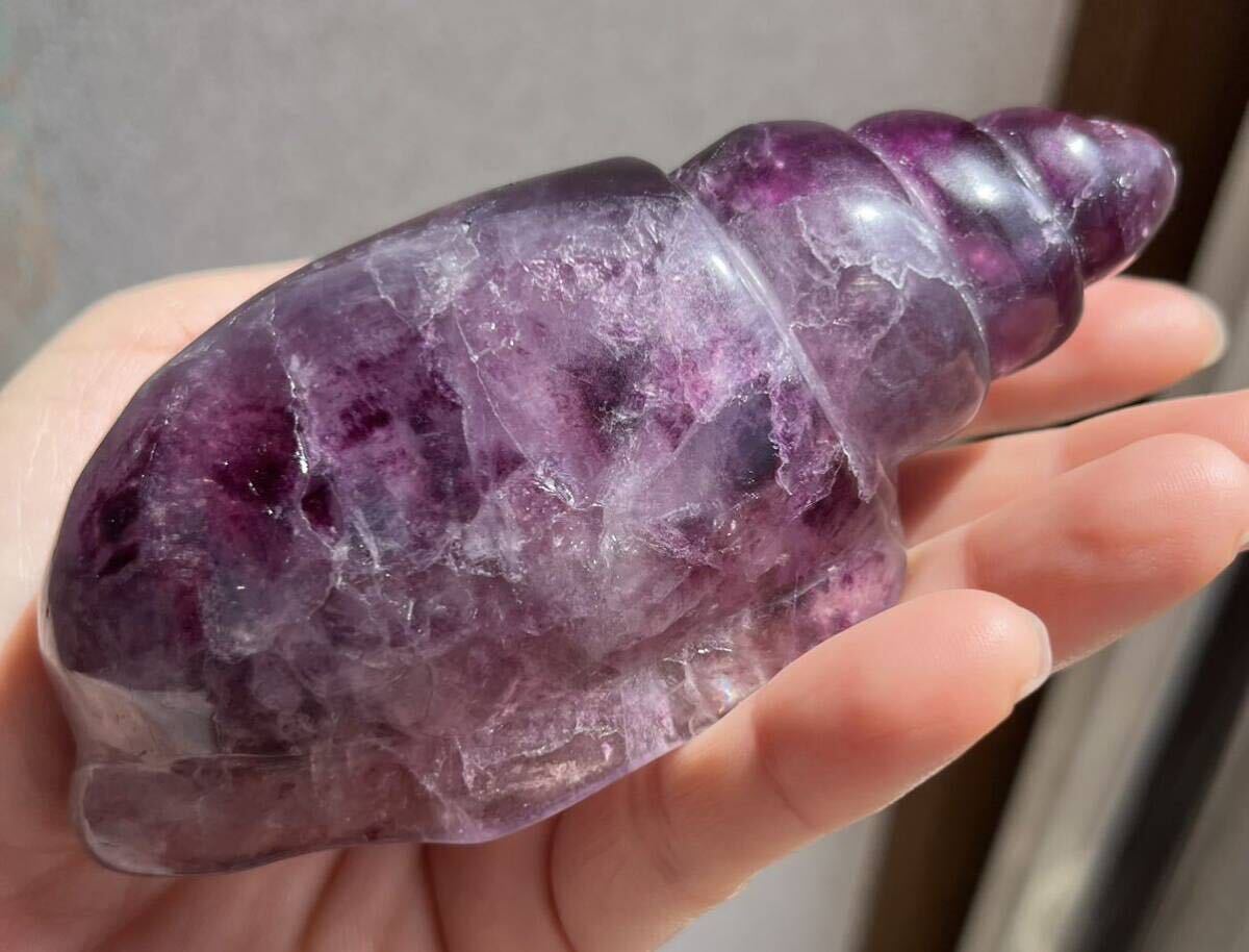 縦約11.7cm 横約54mm 厚さ約44mm 重さ約300g 艶のある品質の良いフローライトで、光の加減で数カ所にレインボーが見られます。ご覧の様に、反面パ-プルと反面の模様とのコントラストが美しい巻貝で、太陽光で撮影しています。フローライトの効果は集中力・エネルギーを高める、明晰性、思考力を養う