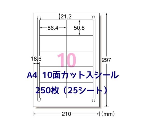 A4サイズ 10面カット入り、ラベルサイズ86.4mm×50.8mm。