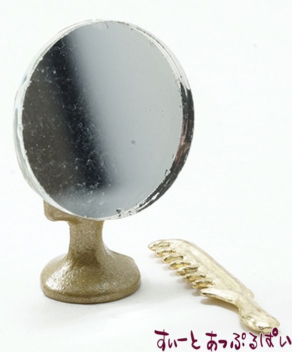 コームと卓上ミラーのミニチュアです。さっと置くだけで、ドールハウスの臨場感がかなりアップしちゃいますね!ぜひお役立て下さい。スケールは1/12です。ぜひあなたのドールハウスに!ミラーのサイズ:W18xD10xH27ミリ。コームのサイズ:17x4ミリ、厚み1ミリ