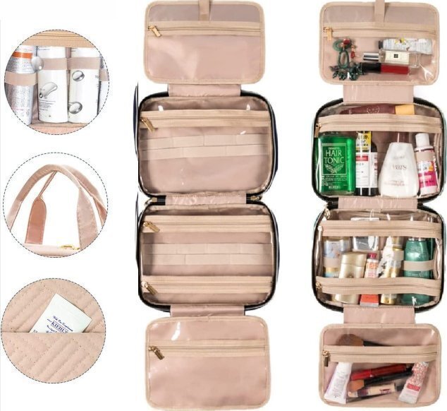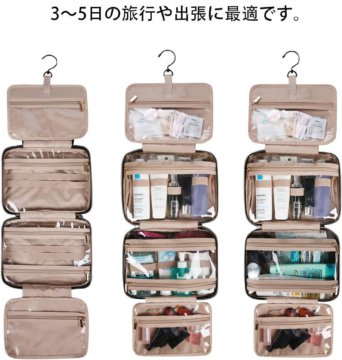 【便利なデザイン】 内部防水のPVC素材を採用で,湿気がある場所での化粧品、バス用品などを収納し、長期間の使用可能です。ほこり、水、傷などから、収納したアイテムを保護します。 4つの独立したコンパートメントにジップとバックオープンポケットで整理整頓に便利です。 一番上のポケットには撥水加工素材を採用し、液体を装着するボトル?香水などに適用し、濡れた毛布などでも安心収納できます。 また、下の大きなポケットには、化粧水や乳液などを立てて収納することができます。メッシュや透明素材を採用しているので、洗面具や小物が綺麗に見えます。また取り出しやすい構造です。 【機能性】しっかりしたパッドが入った機能性とデザインと、しなやかなタッチの耐水性を有するポリエステルピーチスキンです。バッグ全体の形を維持し、収納したコスメ用品、洗面具などに対し優れた保護を提供します。 丈夫な縫製と頑丈な素材で、多くのアイテムの収納が可能です。 【360度回転フック】 折りたたみ可能なフックが付属しています。フックは、旅行用、洗面用具と共にバッグの中に隠すことができ、360度回転するため、シャワーロッド、タオルラック、壁フックなどの様々なシーンで、簡単に掛けることができます。 洗面用具に素早くアクセスでき、シンクとドレッシングスペースの節約に貢献します。 【注意事項】 細かいデザインはメーカー出荷ロットにより変わる可能性がございます。ご了承ください。