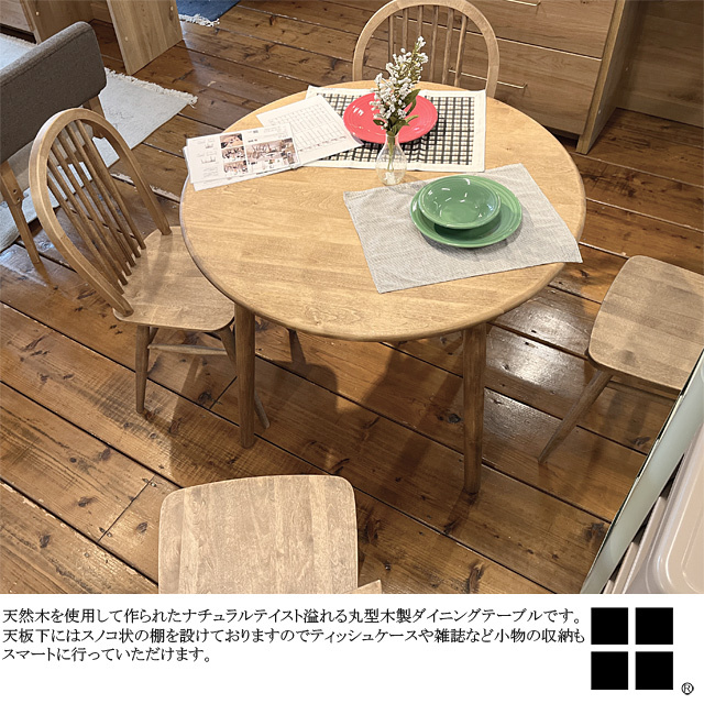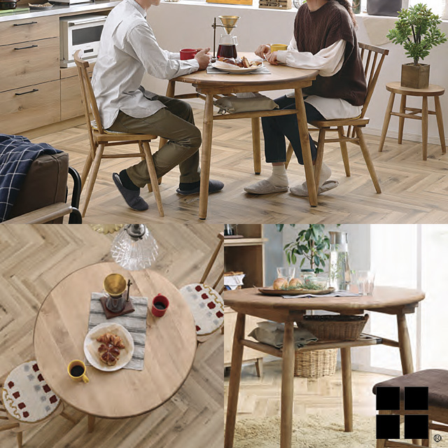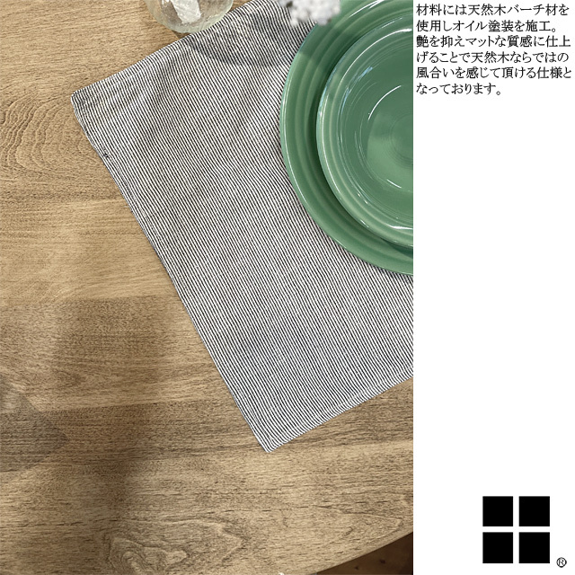 | 天然木を使用して作られたナチュラルテイスト溢れる丸型木製ダイニングテーブルです。 天板下にはスノコ状の棚を設けておりますのでティッシュケースや雑誌など小物の収納もスマートに行っていただけます。 材料には天然木バーチ材を使用しオイル塗装を施工。艶を抑えマットな質感に仕上げることで天然木ならではの風合いを感じて頂ける仕様となっております。 |