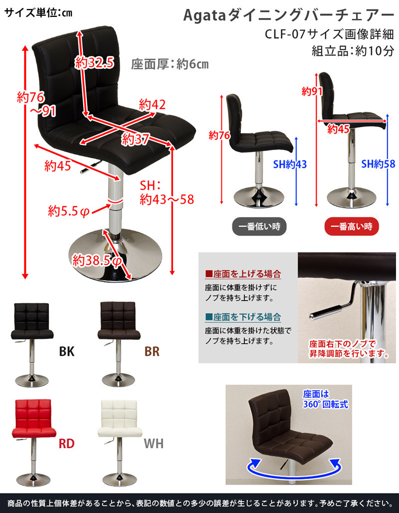 商品説明 | Agata ダイニングバーチェア ブラウン(BR) 落札後、最初の連絡で配達伝票に記載する電話番号をお尋ねします 約6cmの厚いクッション座面のダイニングバーチェアです 厚みがあるので、疲れにくいです 座面の昇降は、レバーを持ち上げるだけの簡単昇降♪ 自由に昇降できます。 [座面を上げる場合] 座面に体重を掛けない状態でノブを持ち上げると上がります [座面を下げる場合] 座面に体重を掛けた状態でノブを持ち上げると下がります 座面は360度回転します。 ガラス天板のダイニングテーブルや脚がクロムメッキ等のダイニングテーブルと相性抜群です。 サイズ・容量 幅420×奥行450×高さ760~910mm(梱包サイズ:幅510×奥行310×高さ430mm)高さ(座面高)430~580mm 座面の厚み:約60mm 本体重量:6.4kg(梱包重量:7.4kg) 組立式(約10分前後/付属の六角レンチにて組立)1梱包 規格 座面:張り材[合成皮革(PUレザー)]、中材[ウレタンフォーム] 脚:スチール(クロームメッキ) 原産国:中国 ブラウン(BR)専用ページです、ホワイト(WH)、レッド(RD)、ブラック(BK)も有りますが別ベージとなってます。 カタログ価格23544円 |