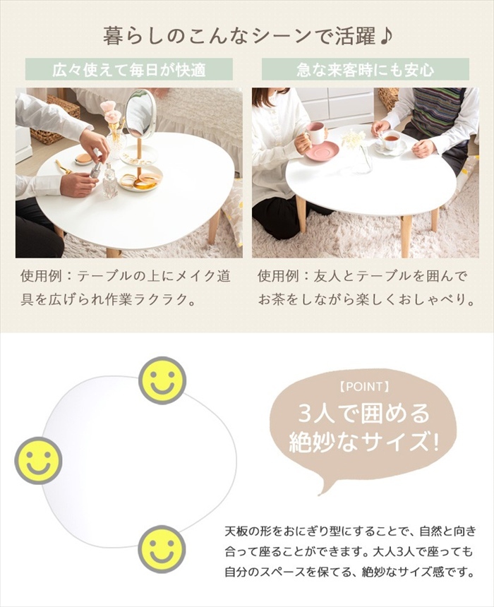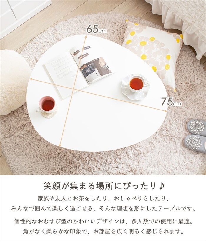 | 丸みを帯びた優しいフォルムと、木のぬくもりが生み出すナチュラルな風合いが人気の「マロン」シリーズから、すっきりした印象のホワイトカラーが登場。 こちらは天板がかわいいおむすび型の楕円形タイプです。 家族や友人など気の合う仲間と囲んで楽しく過ごせるちゃぶ台風のローテーブルは、笑顔の集まる場所になること間違いなし♪ 角が無くやわらかな印象で、お部屋も広く明るく感じられます。 清潔感のある白い天板に、脚はナチュラルな質感を残したツートンカラーがおしゃれ。 北欧インテリアや韓国インテリアなどとコーディネイトしやすいのも嬉しいですね。 脚部は折り畳めるので、お掃除や模様替えの際など移動や収納が簡単。 リビングの主役はもちろん、新生活や一人暮らしのテーブルとしてもおすすめです。 |