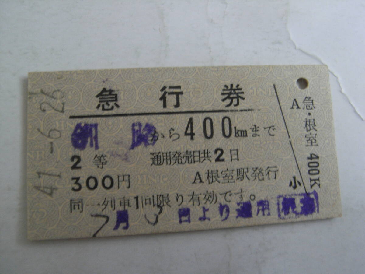 急行券 釧路から400kmまで 2等300円 昭和41年6月26日 根室駅発行