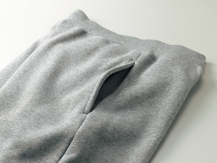 シルエットがとても良く、10オンスの裏起毛で裏地はふかふか生地でとても保温性があり、首周りの縫製や袖口もタブルステッチ加工しているので伸びにくく丈夫な仕様で、パンツウエストはゴム仕様で裏側にヒモが付いております。随所にこのブランドらしくこだわりを感じます。