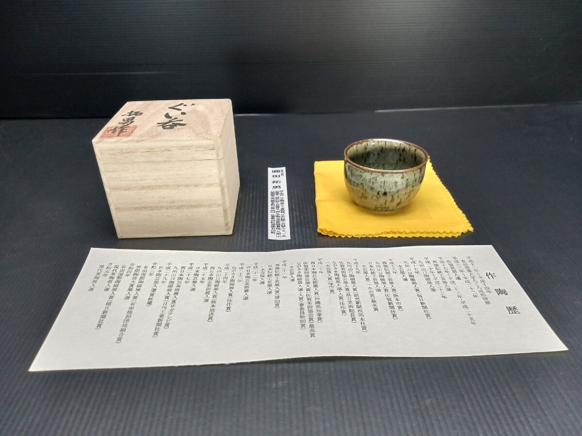 | 商品説明 | 品名:青瓷流鉄ぐい呑 作家:圓田拓男 寸法:径6.7㎝ 高さ4.7㎝ 状態:新品 美術年鑑評価額44万円(評価基準 陶磁器(花瓶)21.2㎝×21.2㎝) 三代 唐山窯 圓田拓男 ●西日本陶芸美術展 沖縄県知事賞 サガテレビ賞 ●西部伝統工芸展 熊本市賞 奨励賞 ●一水会展 一水会賞(最高賞) 佳作賞 ●九州山口陶磁展 毎日新聞社賞 佐賀新聞社賞 読売新聞西部本社賞 日刊工業新聞社賞 ●有田国際陶磁展 朝日新聞社賞 有田焼卸団地組合賞 ●佐賀美術協会展 佐賀美術協会賞(最高賞) 県立美術館長賞 ●ながさき陶磁展 佳作賞 審査員特別賞 ●日本陶芸展 賞候補 ●日本伝統工芸展 現代茶陶展 笠間陶芸大賞展 佐賀県展等、多数入選 |