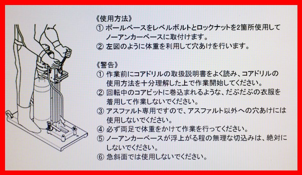 ![]() | 《使用方法》 ① ポールベースをレベルボルトとロックナットを2箇所使用して ノーアンカーベースに取付けます。 ② 左図のように体重を利用して穴あけを行います。 《警告》 ① 作業前にコアドリルの取扱説明書をよく読み、コアドリルの 使用方法を十分理解した上で作業開始してください。 ② 回転中のコアビットに巻込まれるような、だぶだぶの衣服を 着用して作業しないでください。 ③ アスファルト専用ですので、アスファルト以外への穴あけには 使用しないでください。 ④ 必ず両足で体重をかけて作業を行ってください。 ⑤ ノーアンカーベースが浮上がる程の無理な切込みは、絶対に しないでください。 ⑥ 急斜面では使用しないでください。