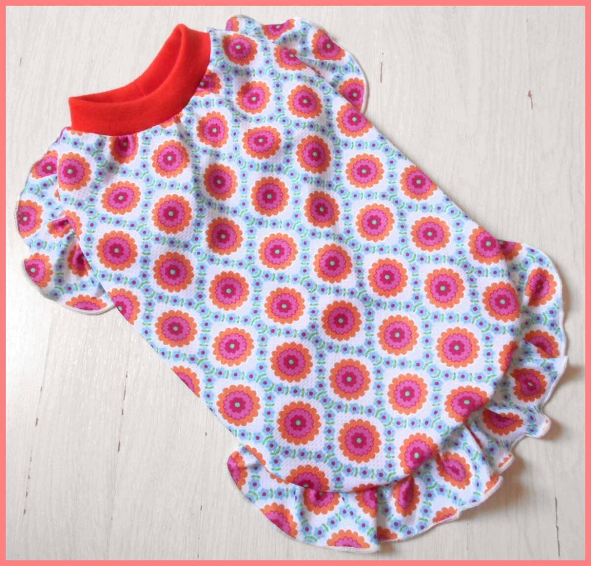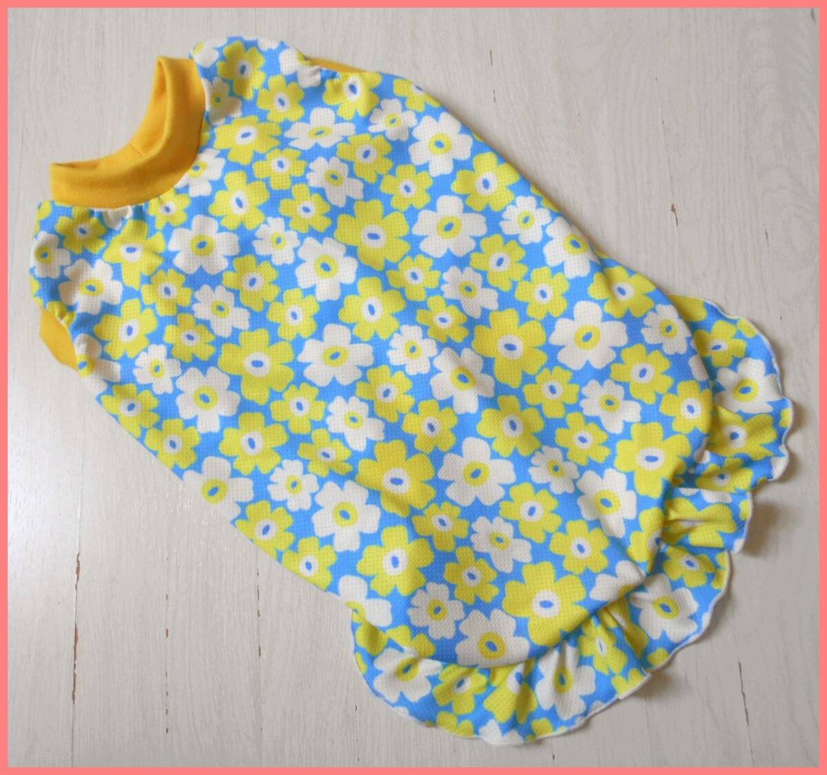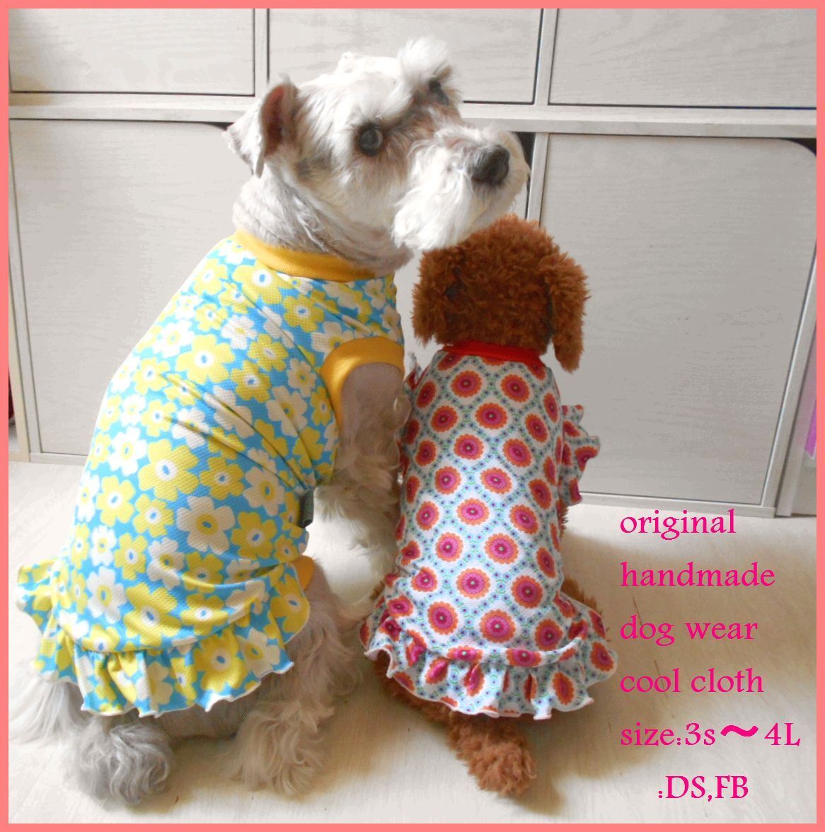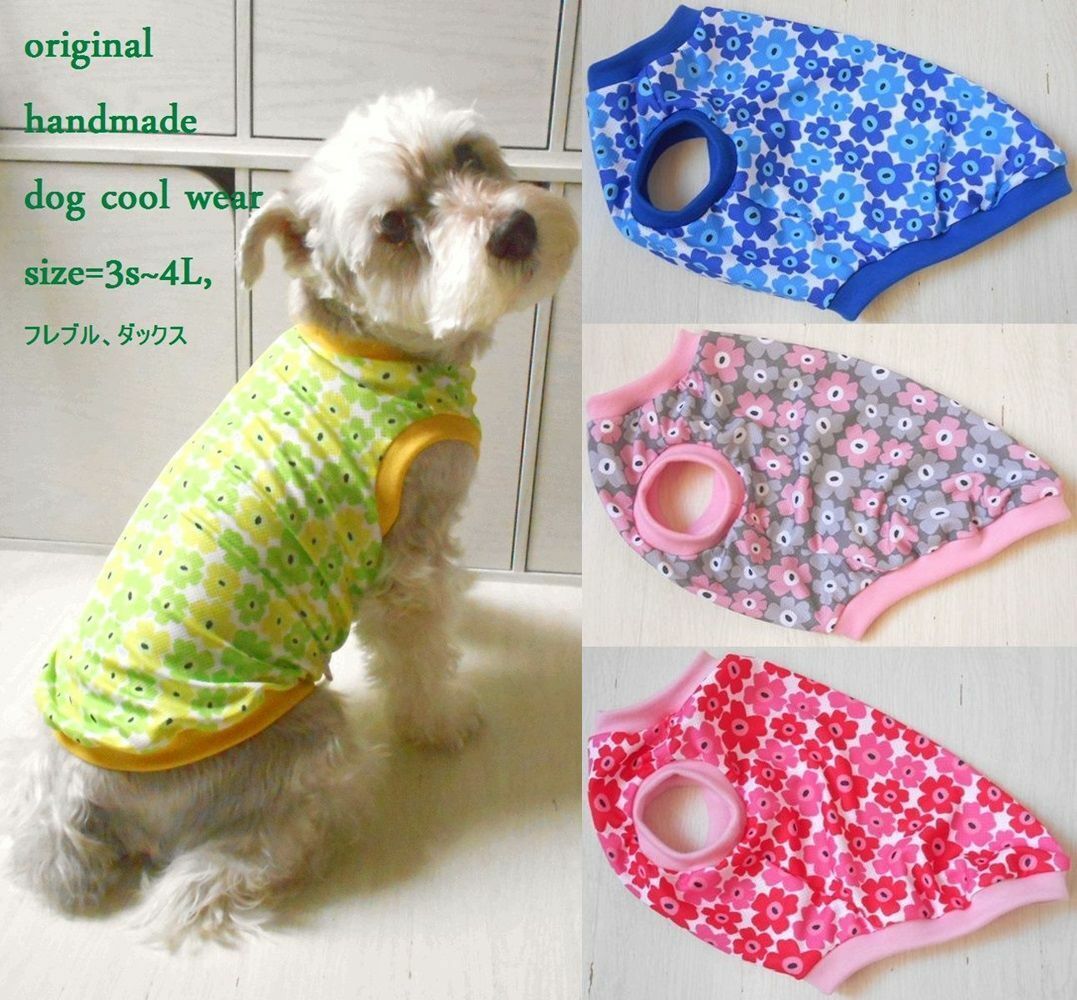 ★ハンドメイドになります、暑い夏に首や肩に濡らしてまくひんやりニット、接触冷感ウォータークールクロス ★今期、欧風花柄とオレンジレトロ調花柄の2種・接触冷感ニットのウェアです。 欧風イエロー系の花柄は以前出品している4色のものと同柄になります。 お揃い可愛いですよ!(^^♪ オレンジリブのレトロ調花柄もとっても可愛いです。リブを白にしても可愛いと思います! リブは10色からお選び頂けます。 ナイロン55% ポリエステル45%。【消臭・抗菌加工】【吸水速乾】UVカット率約90% 冷感ナイロン糸を使用していますのでそのままでも冷たく、水に濡らすと特殊異形断面の糸によって 気化熱作用が促進され、これまたひんやりとします。 リブは東レさんの優れた吸汗速乾フライスです。クールウォーター生地にピッタリ。 価格は1点の価格です。 生地は薄手でツルツルしたひんやりストレッチ生地です。 暑さに弱いワンちゃん、肌の弱いワンちゃんにもおすすめです。 速乾性もあり水遊びにもおすすめです! 尚、袖と裾フリルご希望の場合は追加料金500円。 袖か裾、どちらかにフリルの場合は追加料金300円になります。 各フリルのみで別出品しておりますのでご希望の場合は そちらも一緒にお買い上げくださいますようお願い致します。 ご落札後ご希望のサイズをお知らせください。 サイズに関してのご質問はお気軽にお願い致します。 尚、サイズオーダーの為、お振込確認後の作製になります事を ご了承ください (出来上がりサイズ(リブ込み)) 3S=着丈21.5、胴周り31、首周り16、目安体重1.5~2kg SS=着丈25、5、胴周り35、首周り19、目安体重2~3kg S=着丈27、胴周り40、首周り22、目安体重3~4kg M=着丈33、胴周り47、首周り26、目安体重4~6kg ダックスS=着丈32、胴周り40、首周り22、目安体重3~4kg ダックスM=着丈35,5、胴周り49、首周り26、目安体重4~6kg 中型犬は別に出品しています。 仕上がり寸法を記載しております。ワンちゃんのヌード寸法に 小型犬は首2cm、胴周り3~4cm、 中型犬は首3cm、胴周り5~6cm余裕を見てご注文ください。 (サイズの測り方) 首回り=一般首輪の下を一周、きつくなくゆるくなく測ります。 胴回り=前足脇、胸の一番太い部分を一周、きつくなくゆるくなく測ります。 着丈(リブニット込)=首回り位置から尻尾まで。 お腹側の丈はご希望が御座いましたらお知らせ願います。 ワンちゃんのヌード寸法をお知らせ頂ければこちらでサイズ調整も 可能です。ご質問をお願い致します。 サイズ調整や変更にあたり追加料金が発生 する場合が御座いますので前もってご質問をお願い致します。 ミシンは2本針4本糸ロックミシンを使用。 趣味で作成しておりますのでご理解頂きどうぞ宜しくお願い 致します。 (注意事項) ★マイナス評価のある方で、キャンセルの多い方、 落札されてもご連絡がないという方、その他、内容に不安が 感じられる方のご入札は大変勝手では御座いますが、 ご入札がある場合、取消させて頂きます。ご了承下さいませ。 落札後のキャンセルはご遠慮願いますので商品に関しても疑問、 ご質問等はご遠慮なくお願い致します。 迅速丁寧を心がけ一生懸命対応しておりますがショップの様な 完璧な対応はできかねますので完璧なお取引を望む方や USED品に関してかなり神経質な方のご入札は 申しわけ御座いませんがご入札をお控え下さいませ。 ★商品説明欄にて一番安価な発送方法を記載させて頂いております。 無理な発送のご希望、商品、送料の値切りはお受けできません。 ★普通郵便は何分、事故等の補償が御座いませんので御理解の上、 発送希望を お知らせ願います。 ★当方洋裁をしておりますのでまれに商品に糸くずや毛糸、 梱包用品の一部など付着している場合が御座います。 確認しているつもりでも見落としがある場合が御座いますので 御理解の上どうぞ宜しくお願い致します。 ★メッセージのみの売り買いですので心ないメッセージや不快な メッセージはどうか御遠慮頂けますようお願い申し上げます。 |