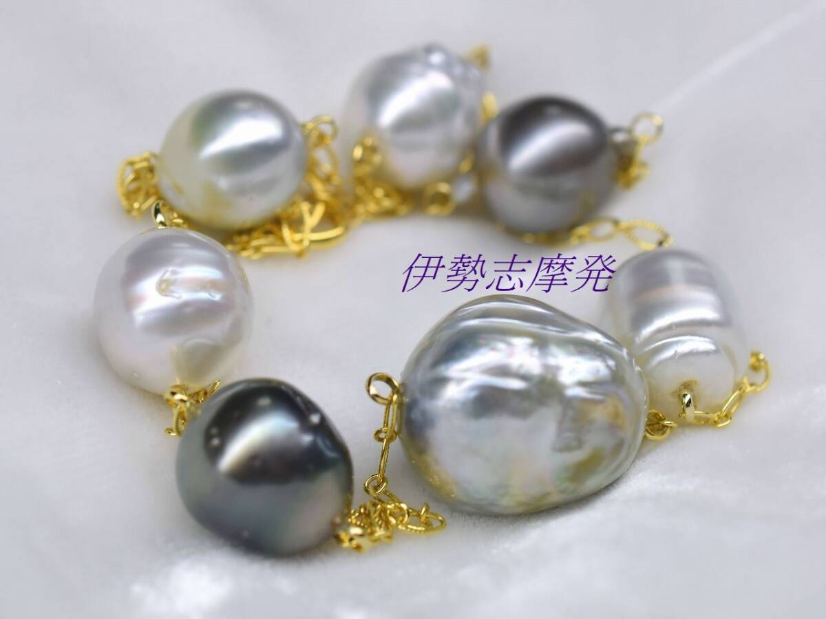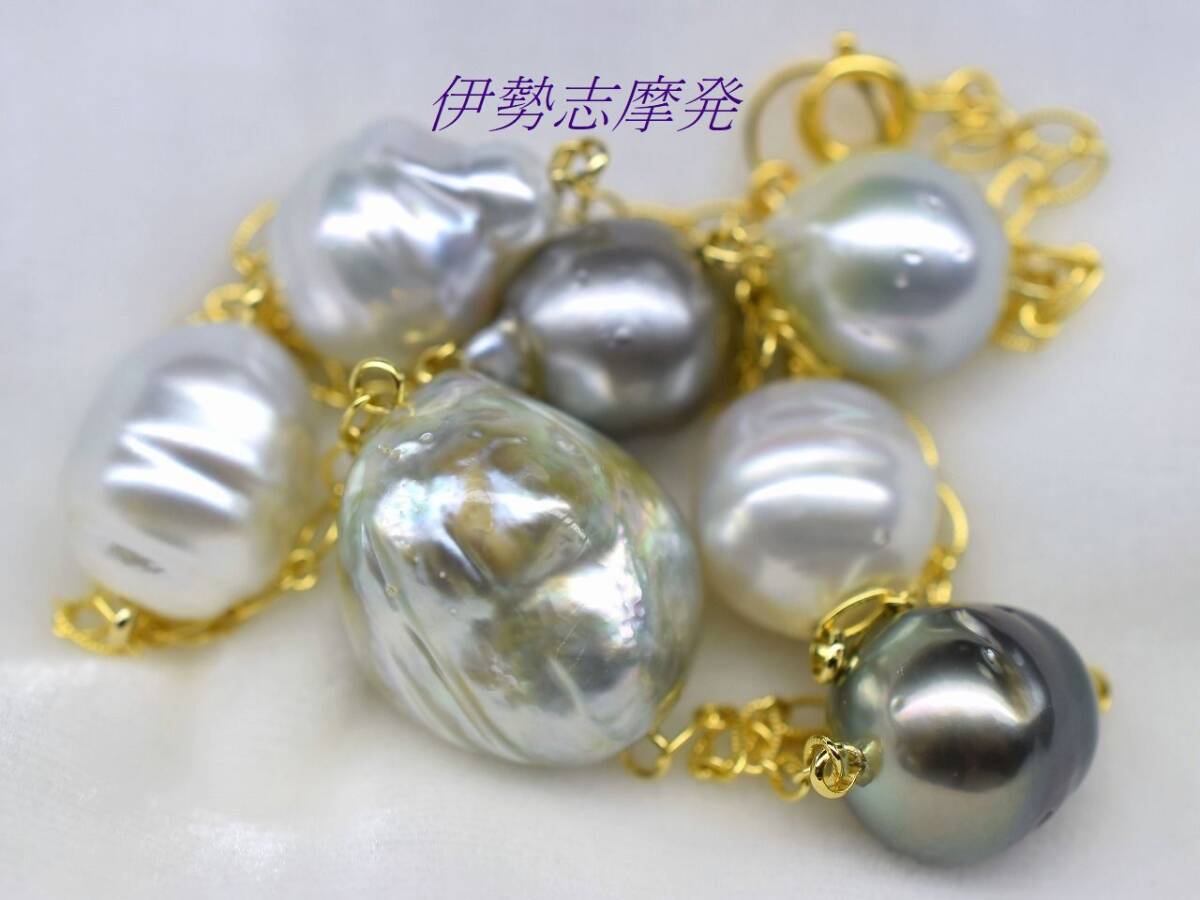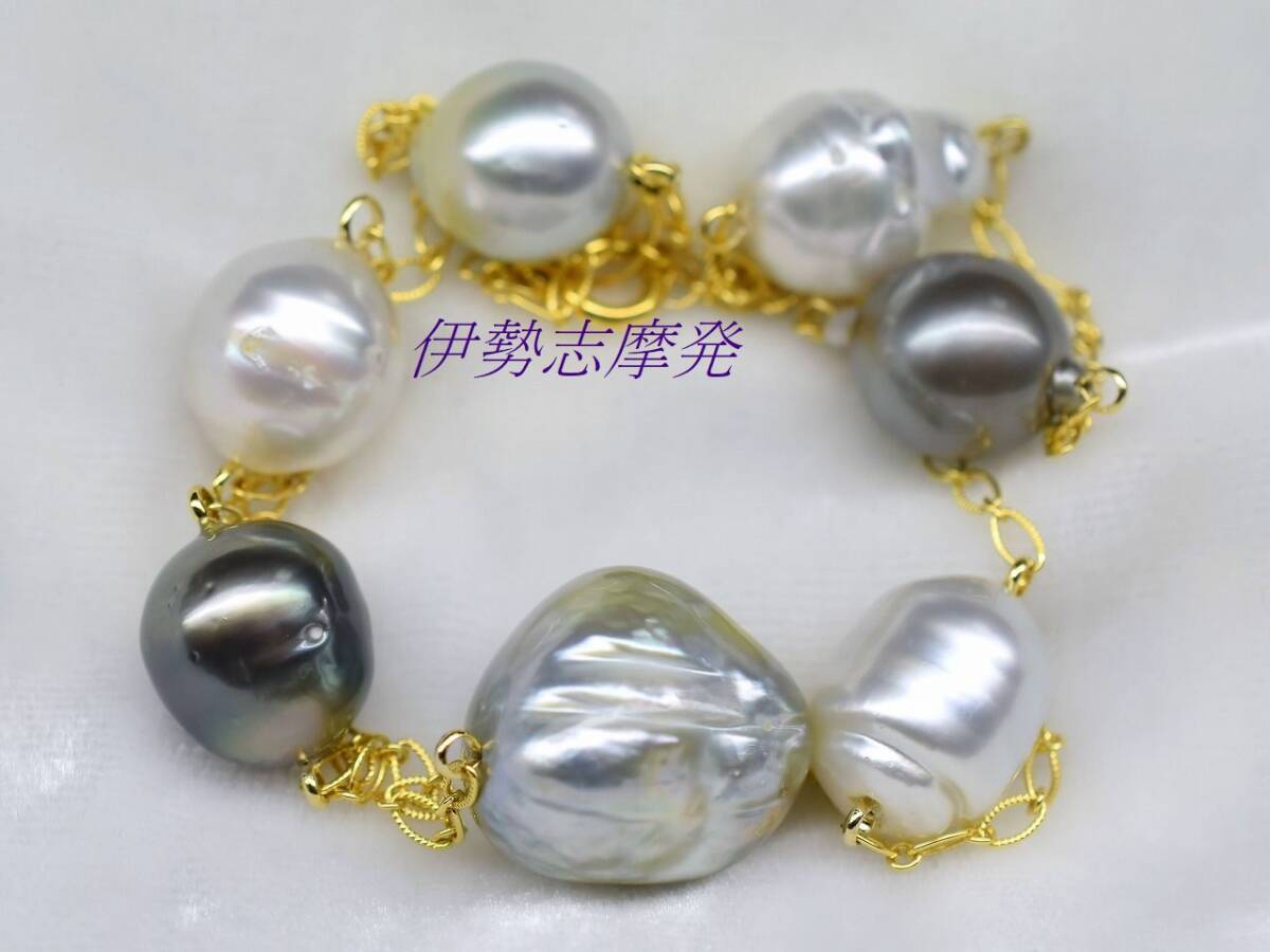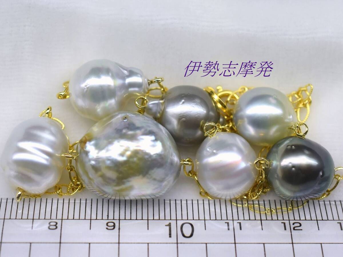 【真珠の種類】 南洋白蝶ナチュラル真珠 【珠サイズ】 18,8㎜x15,97㎜ー12,1㎜x11㎜ 【珠の形状】 バロック・オーバル 【色】 メタリックグリーンピンクほか 【巻き】 非常に良い◎ 【照り】 非常に良い◎ 【キズ】 バロック珠なので巻きじわなどあり 【エクボ】 バロック珠なので多少 【金具の材質】 シルバー 【デザインの大きさなど】全長45,5cm ◆南洋白蝶天然真珠、真珠層も厚くテリも非常に強い為、その存在感は格別!特に大きな珠でお作りしました魅力のネックレスです。◆ センター珠に18,8㎜x15,97㎜!最大級の大きさを持つ真珠貝から出た南洋白蝶ナチュラル真珠、目を見張る仰天サイズ!その存在感とリッチな光沢でゴージャスに光輝く、インパクト抜群の希少な珠でおつくりしましたネックレスです。一番小さな珠でも12,1x11㎜珠あります。 センター珠の是ほどのボリュームはめったに出会える物ではありません。バロック珠特有のフォルムも最大の魅力ですが、メタリックにゴールドとグリーンやブルー、ピンクなどが入り混じった表情豊かで複雑な色彩を織りなす、レアカラーにもため息がもれます。 サイズだけではなくお色目やテリ感まで、遠くからでも目立つその存在感は半端なし!シルバーチェーンも動きに合わせてきらきらと輝き一層高級感が増します。人とは違う個性的な真珠をつけたい方、白蝶真珠のバロック珠をぜひ着けてみてください。 真珠に対するイメージが変わるかと思います。 | ||||||||
