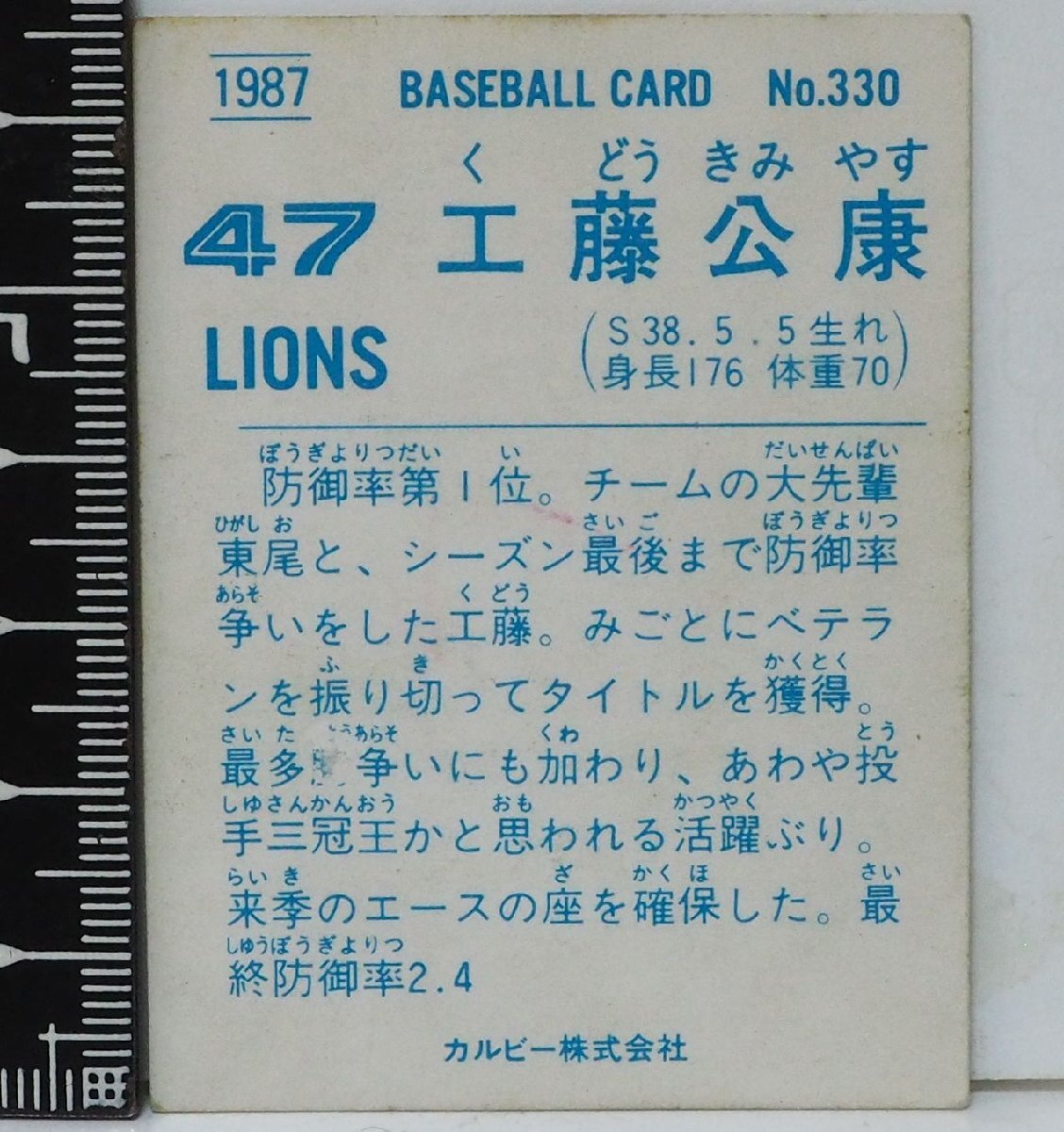 87年 カルビー プロ野球カード No.330金枠【最高勝率 最優秀防御率 工藤 公康 西武ライオンズ】昭和62年 1987年 当時物 Calbee食玩【中古】