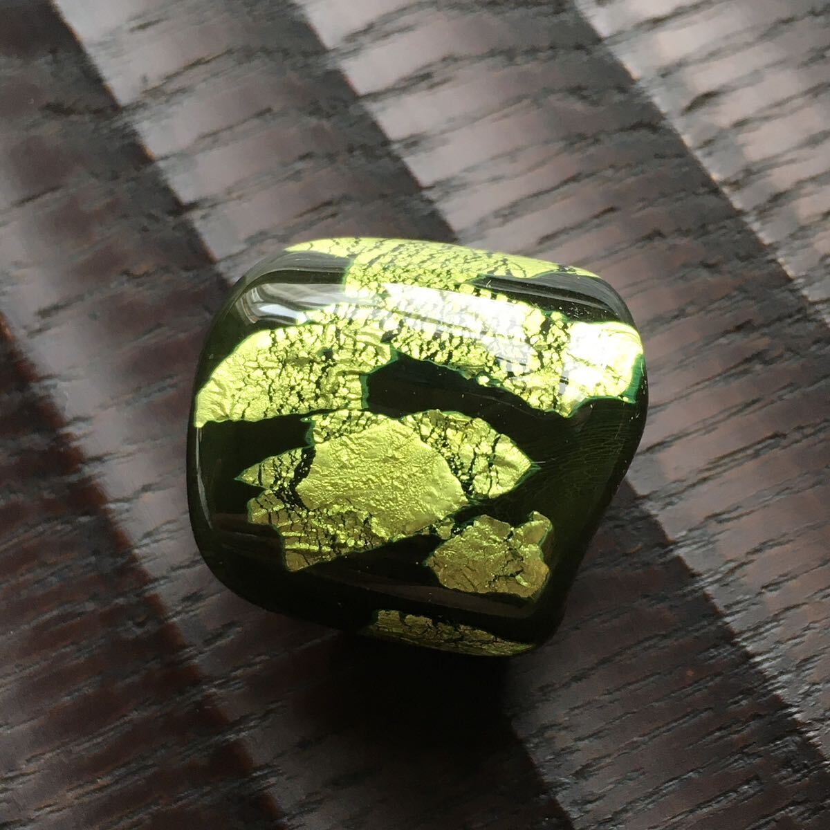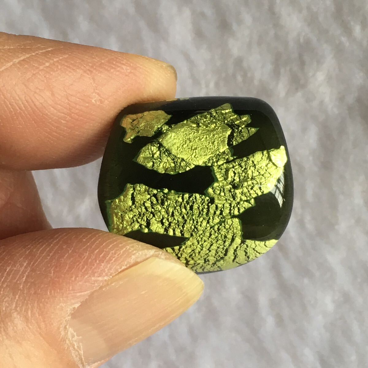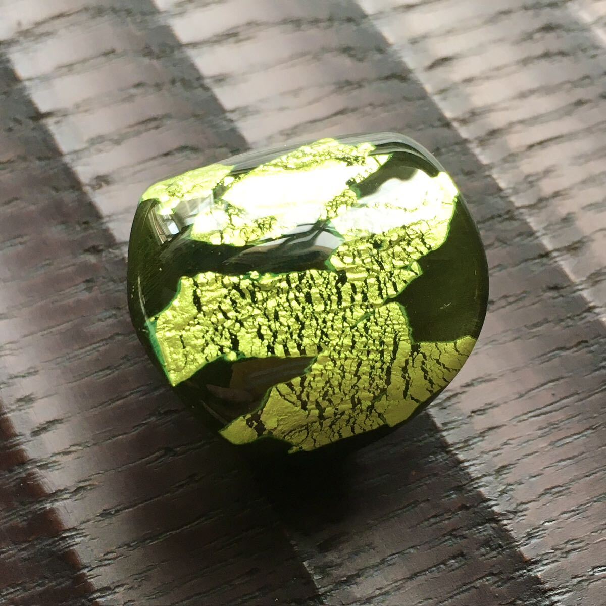 ガラスは二層になっていて、黒いガラスの表面に銀箔を貼り合わせ、その上から黄緑色のガラスを被せています。
